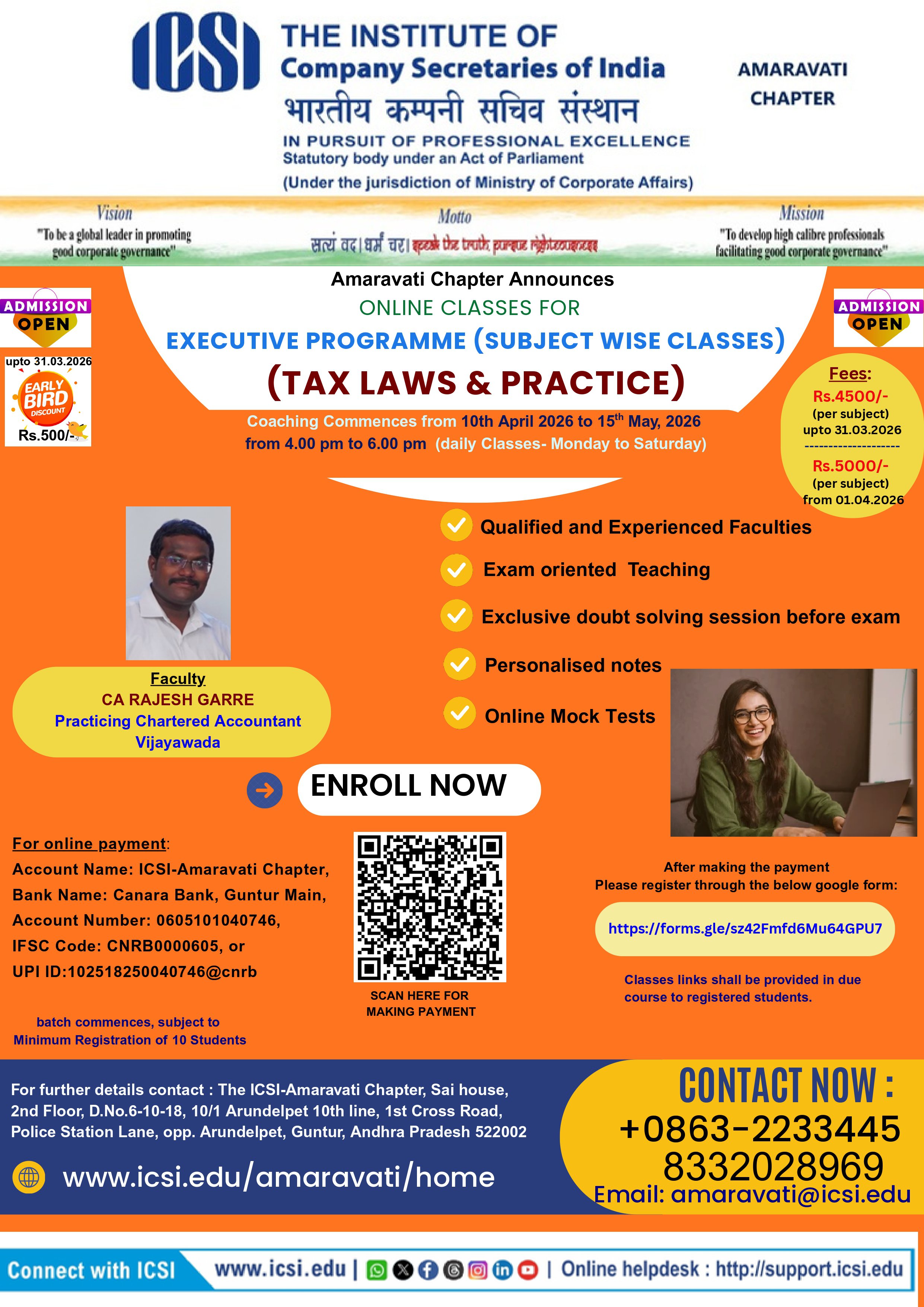CLASS ROOM TEACHING FOR (Physical mode) CS EXECUTIVE ENTRANCE TEST (CSEET) for JUNE 2026 EXAMINATIONS AT ICSI AMARAVATI CHAPTER PREMISES, GUNTUR, ANDHRA PRADESH 522002: