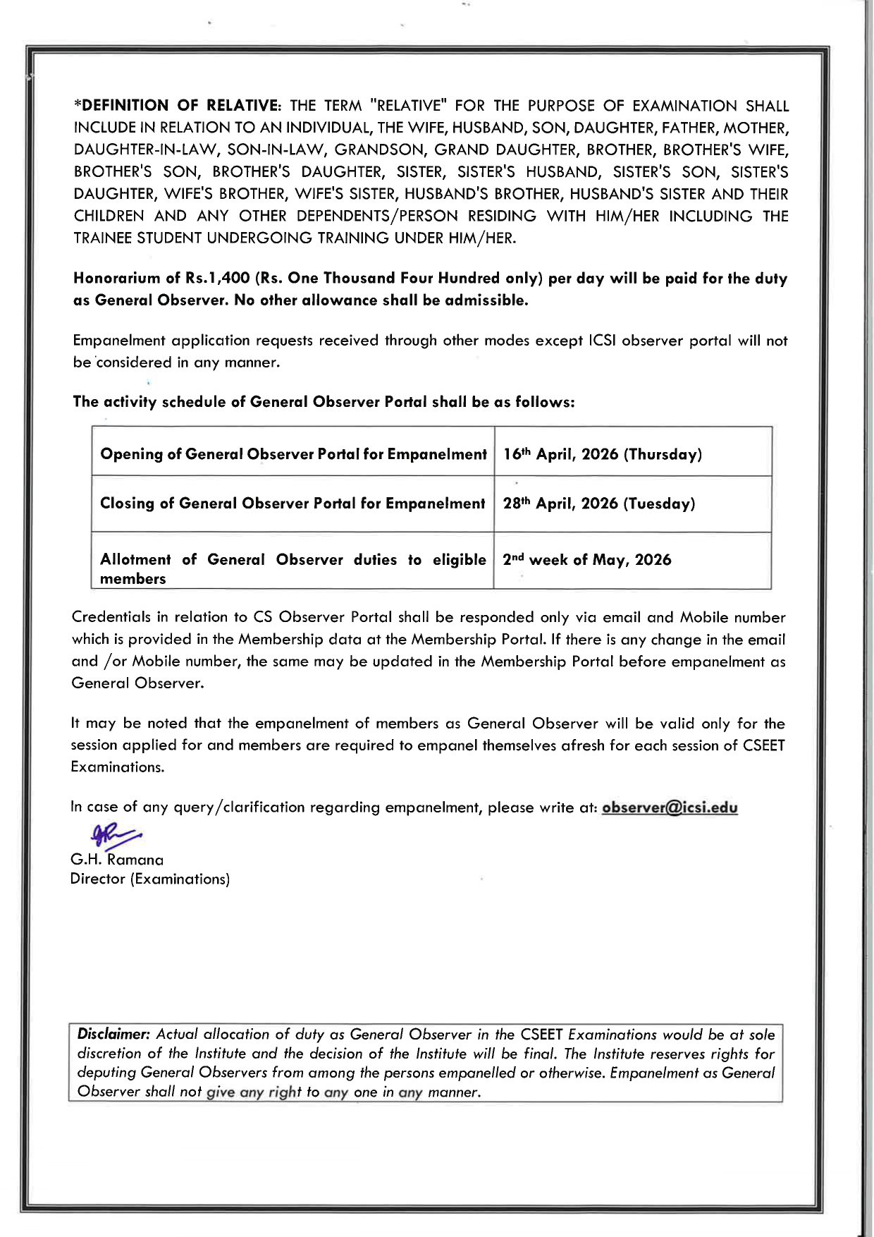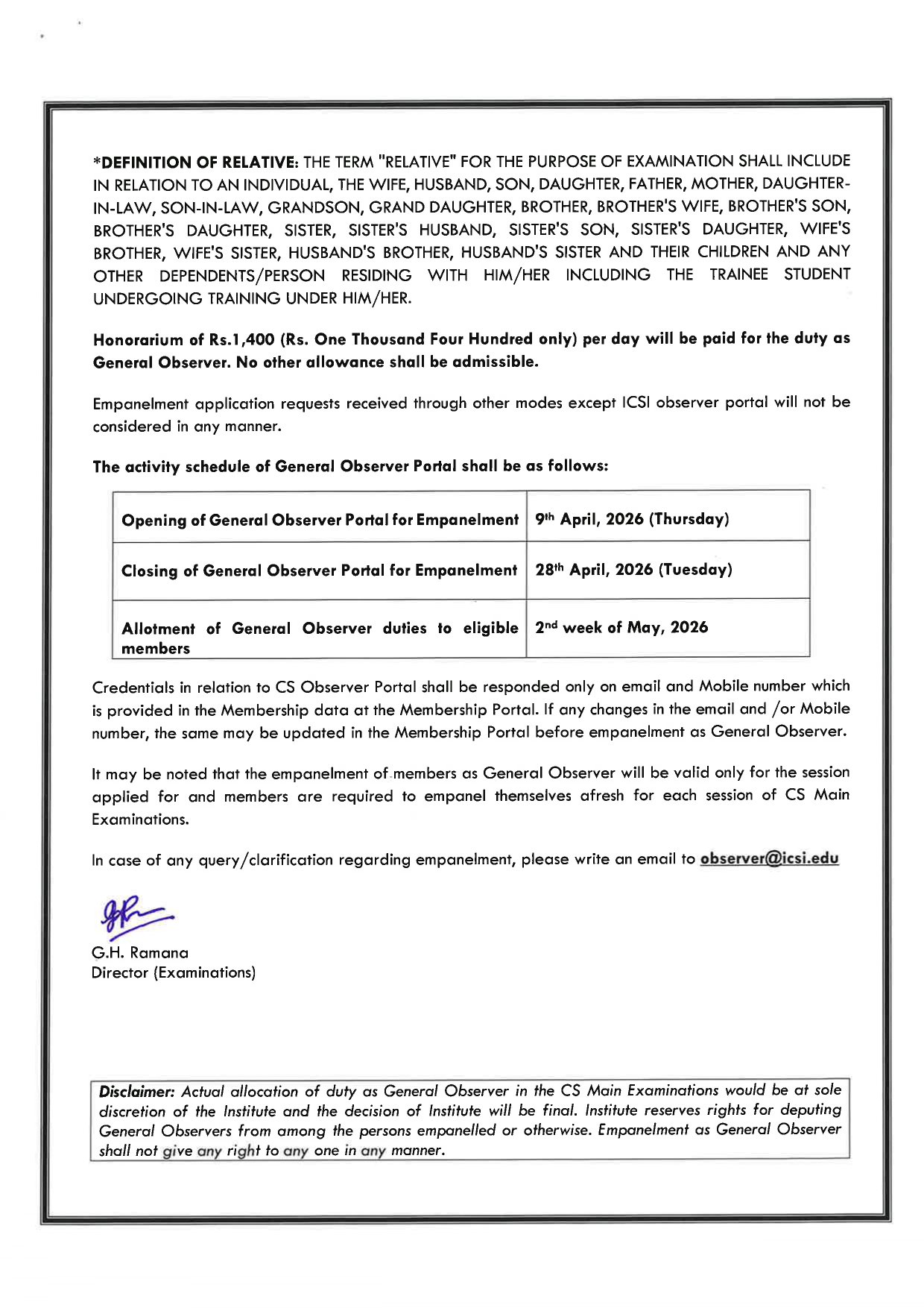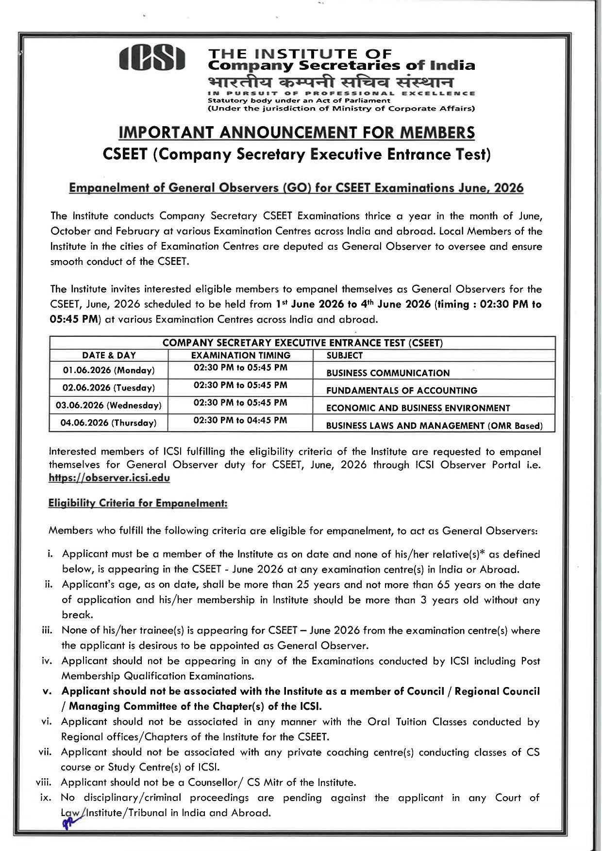 Empanelment of General Observers (GO) in Online Mode for CS Main Examinations, June, 2026