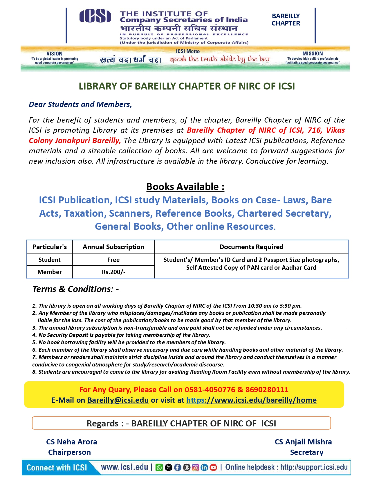 LIBRARY OF BAREILLY CHAPTER OF NIRC OF ICSI