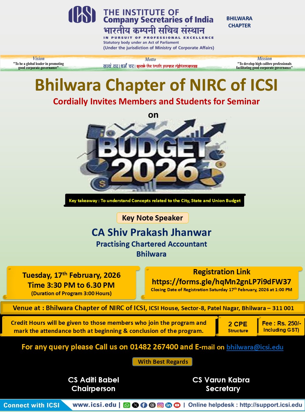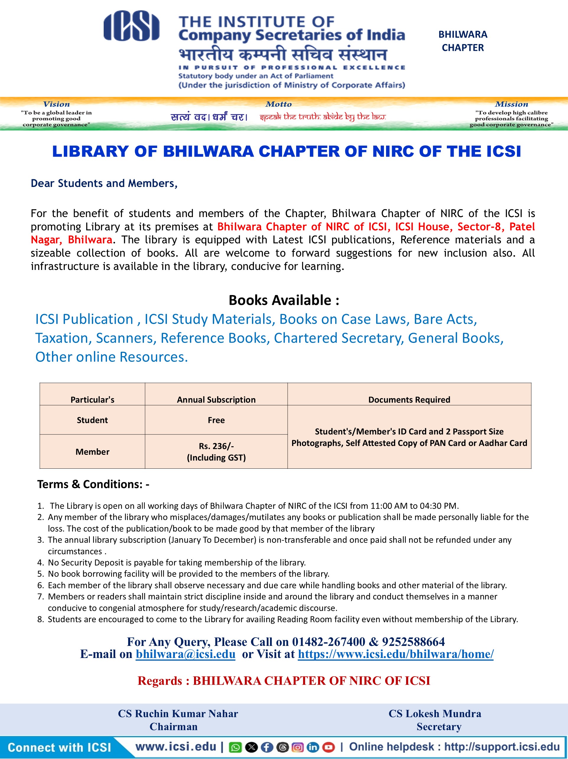 Library Facilities for Students and Members of Bhilwara Chapter of NIRC of ICSI