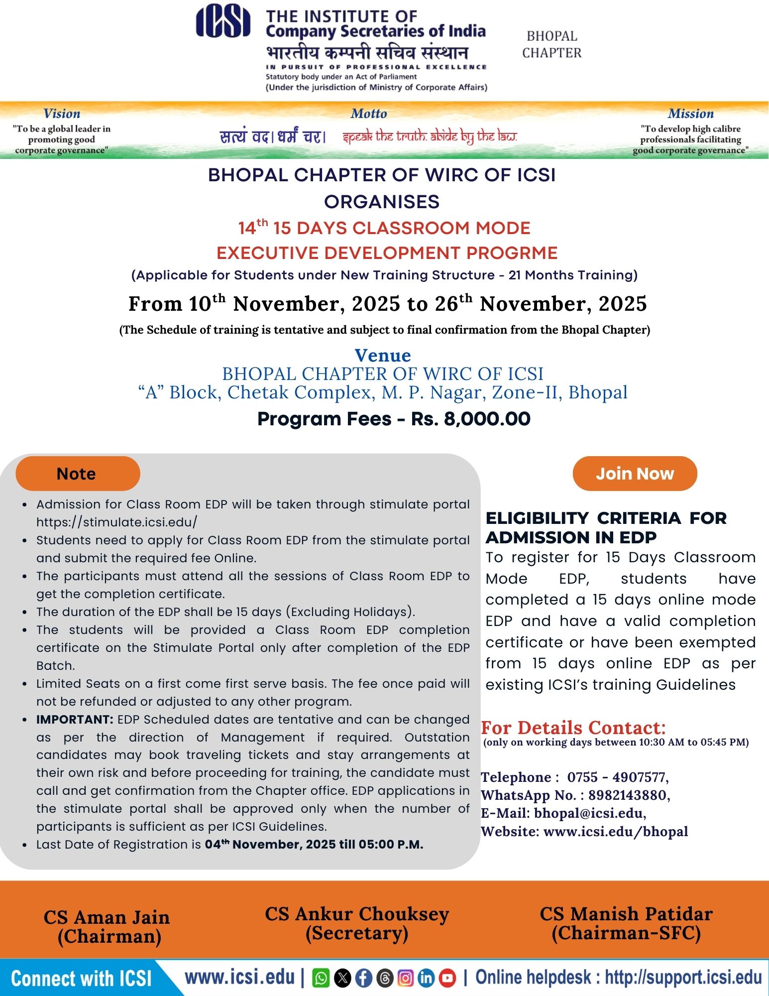 14th 15 Days Classroom Mode Executive Development Programme from 10.11.2025 to 26.11.2025