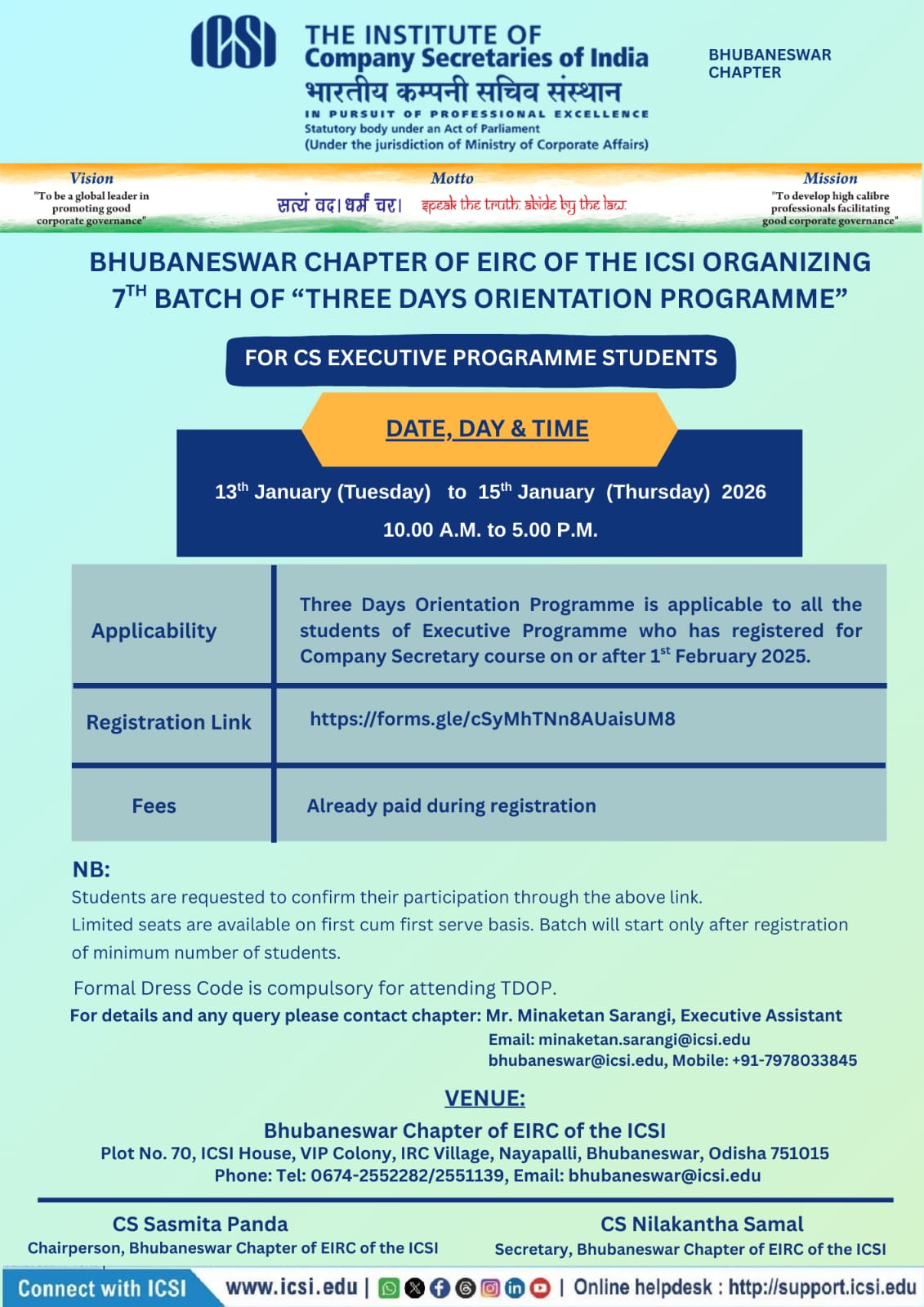 Bhubaneswar Chapter of EIRC of the ICSI Class Room Teaching - Hurry Up ! Registration Open for December 2025 session of examination
