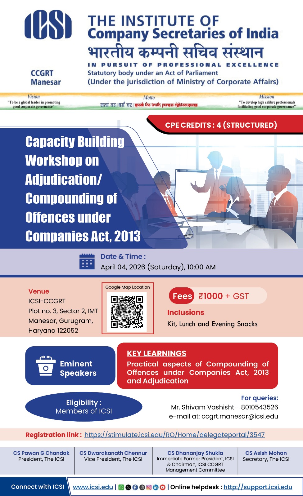 Registration Open | Capacity Building Workshop on Adjudication/Compounding of Offences under Companies Act, 2013 on 04th April 2026