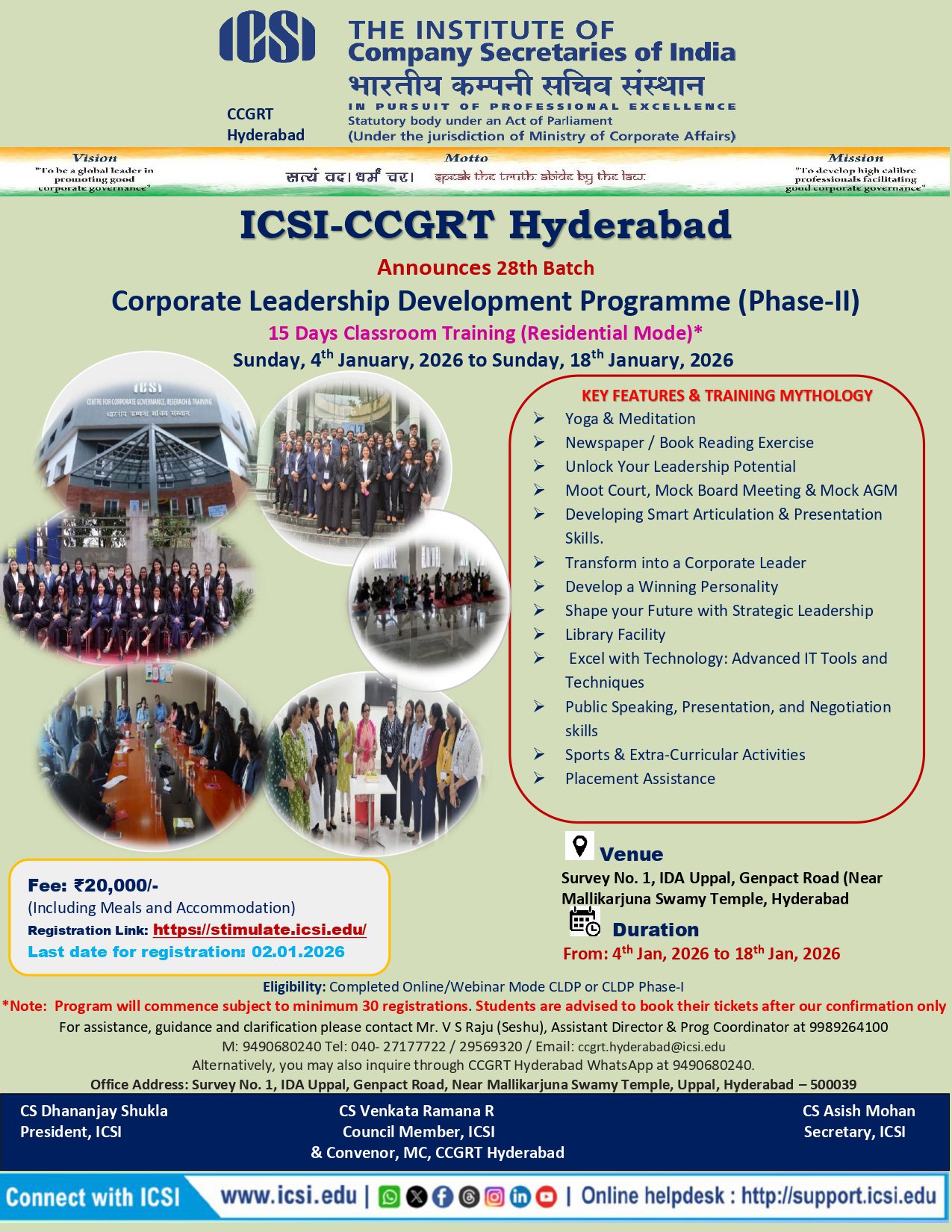 ICSI CCGRT Hyderabad's 28th CLDP (Phase 2) - Sunday, 4th January, 2026 to Sunday, 18th January, 2026