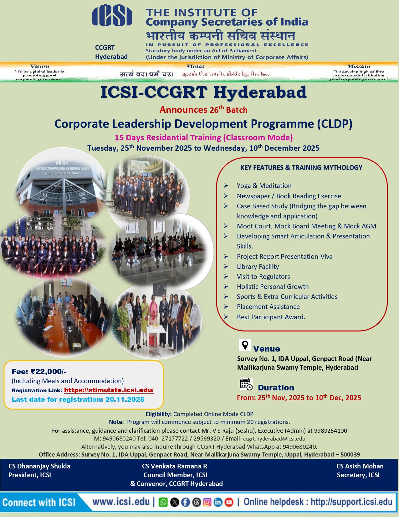 The Centre for Corporate Governance Research and Training-Hyderabad (CCGRT-Hyd) is a Training and Research wing of the ICSI. Inaugurated by the former Hon’ble Vice President of India, Shri M Venkaiah Naidu, on 16th September, 2017, CCGRT-Hyd started operations from Aug, 2018 with the goal to promote and develop research, training, & publications for students and members.