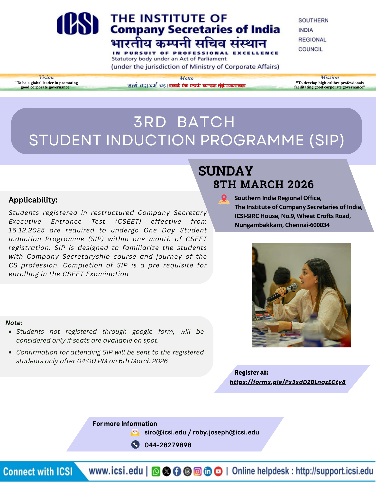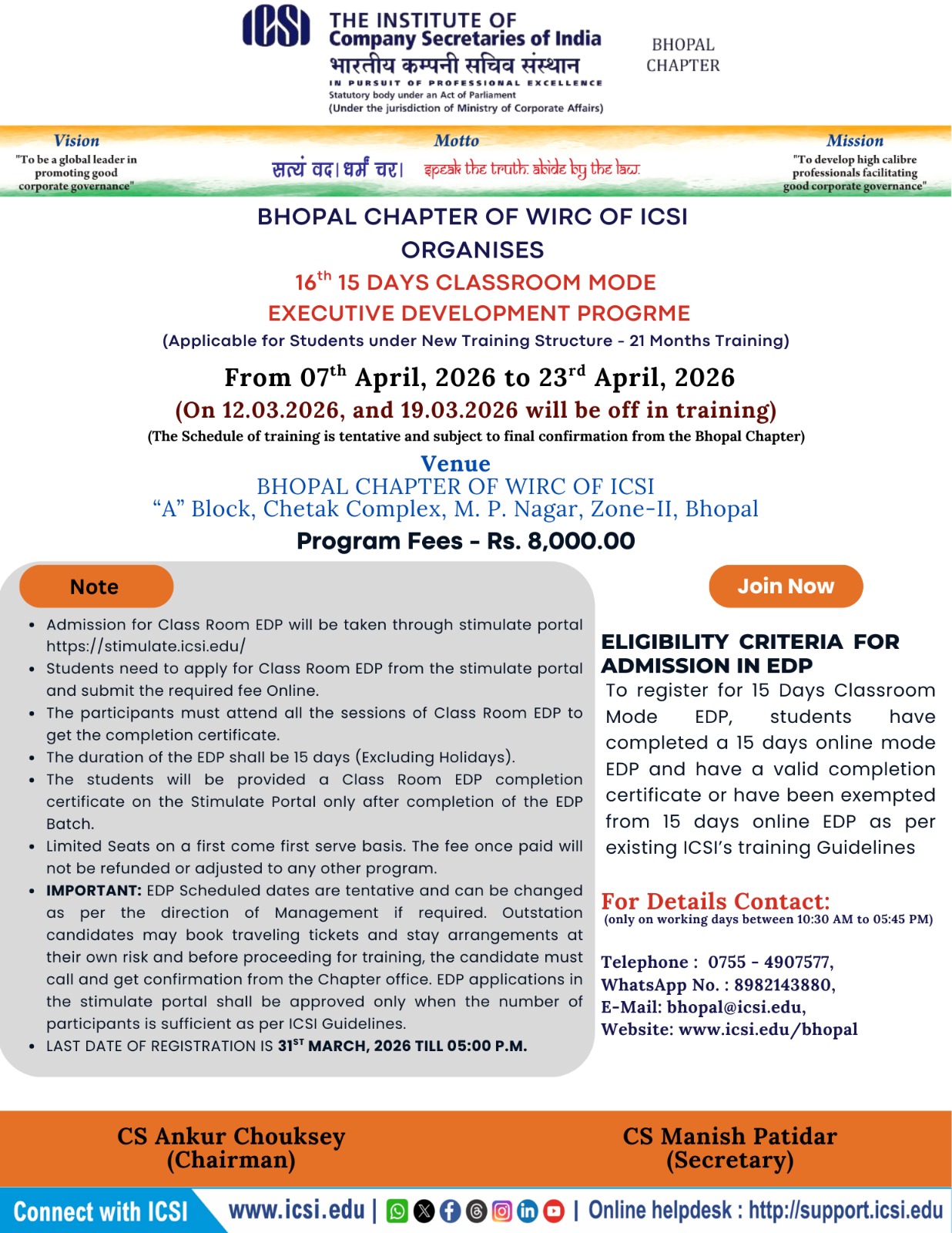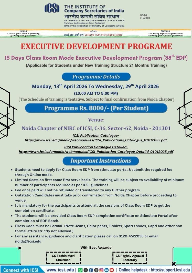 - Bhubaneswar Chapter Organizing - 08th Batch of Three Days Orientation Program (TDOP) will be held on 25th February to 27th February, 2026 at Chapter Office Premises. For any query please contact Chapter Office: 0674-2552282 / 2551139, mail to: bhubaneswar@icsi.edu