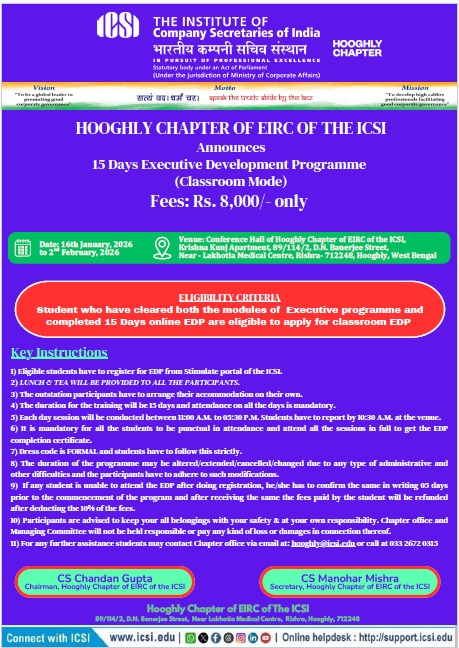 •For details and query, please contact Program Co-Ordinator, Ms. Rukmani Nag at Phone No. 033-2672 0315, Email Id: hooghly@icsi.edu