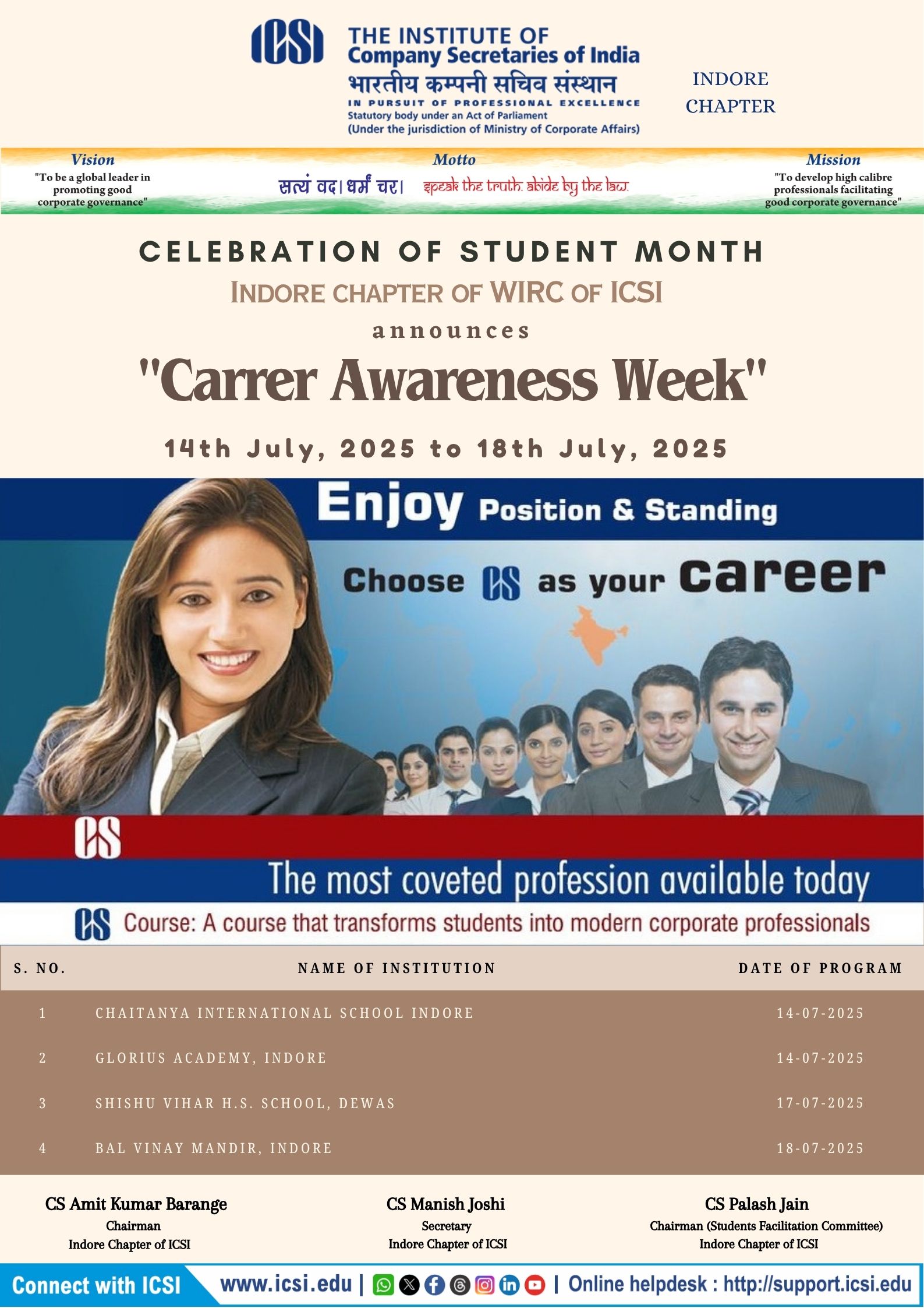 INDORE CHAPTER CELEBRATES "CARRER AWARENESS WEEK" FROM 14.07.2024 TO 18.07.2024