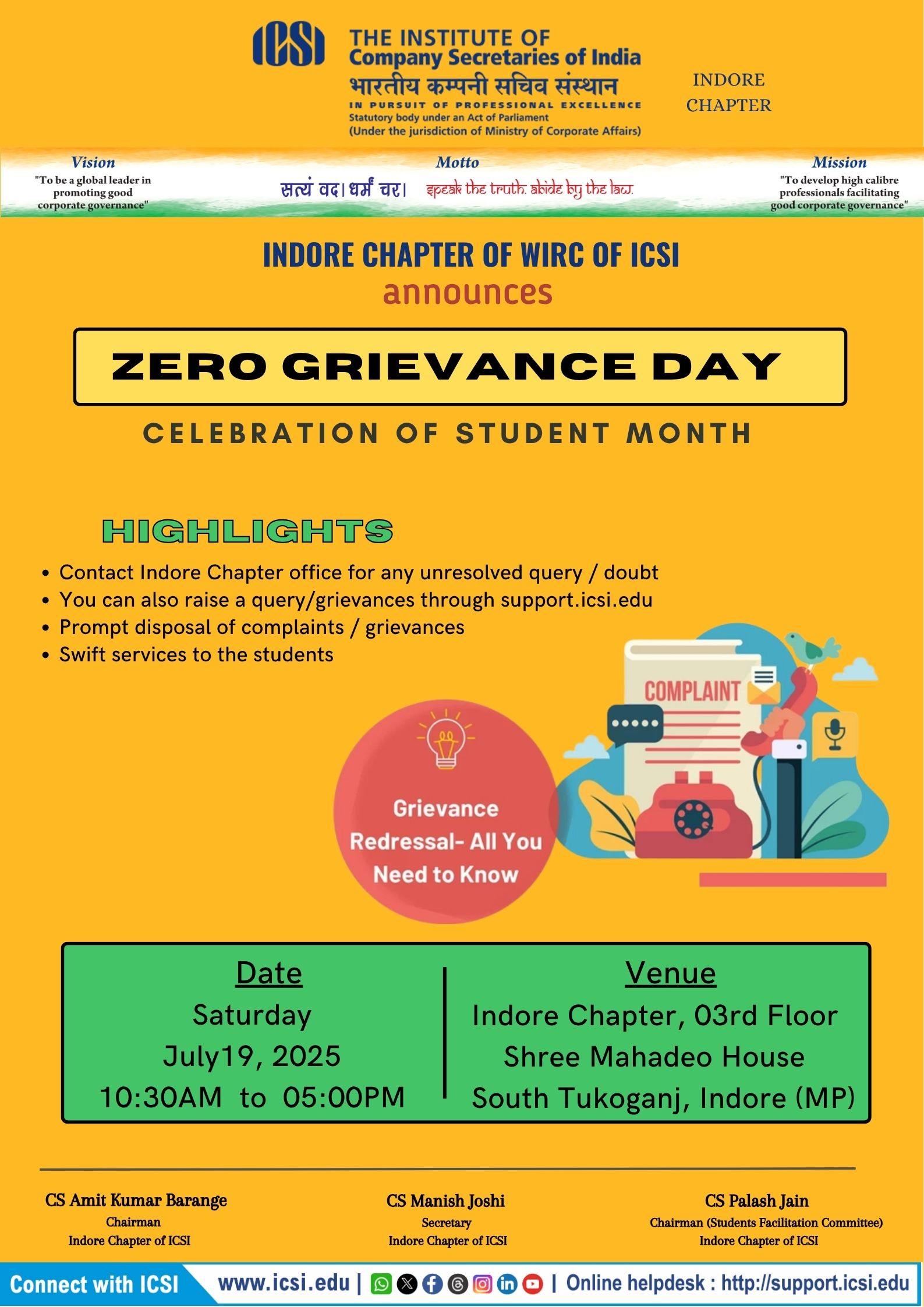 • Student Month is an opportunity for the students to interact with the Institute. The students have been enthusiastically participating in the various activities during the Student Month. In context to that Indore Chapter announced an "Zero Grievance Day". This event is a fantastic opportunity for you to to foster a supportive and understanding environment and let go of complaints . By celebrating Zero Grievance Day, we all learn the value of empathy, kindness, and cooperation. We encourage all students to participate and make the most of this enriching experience. Looking forward to your presence!
