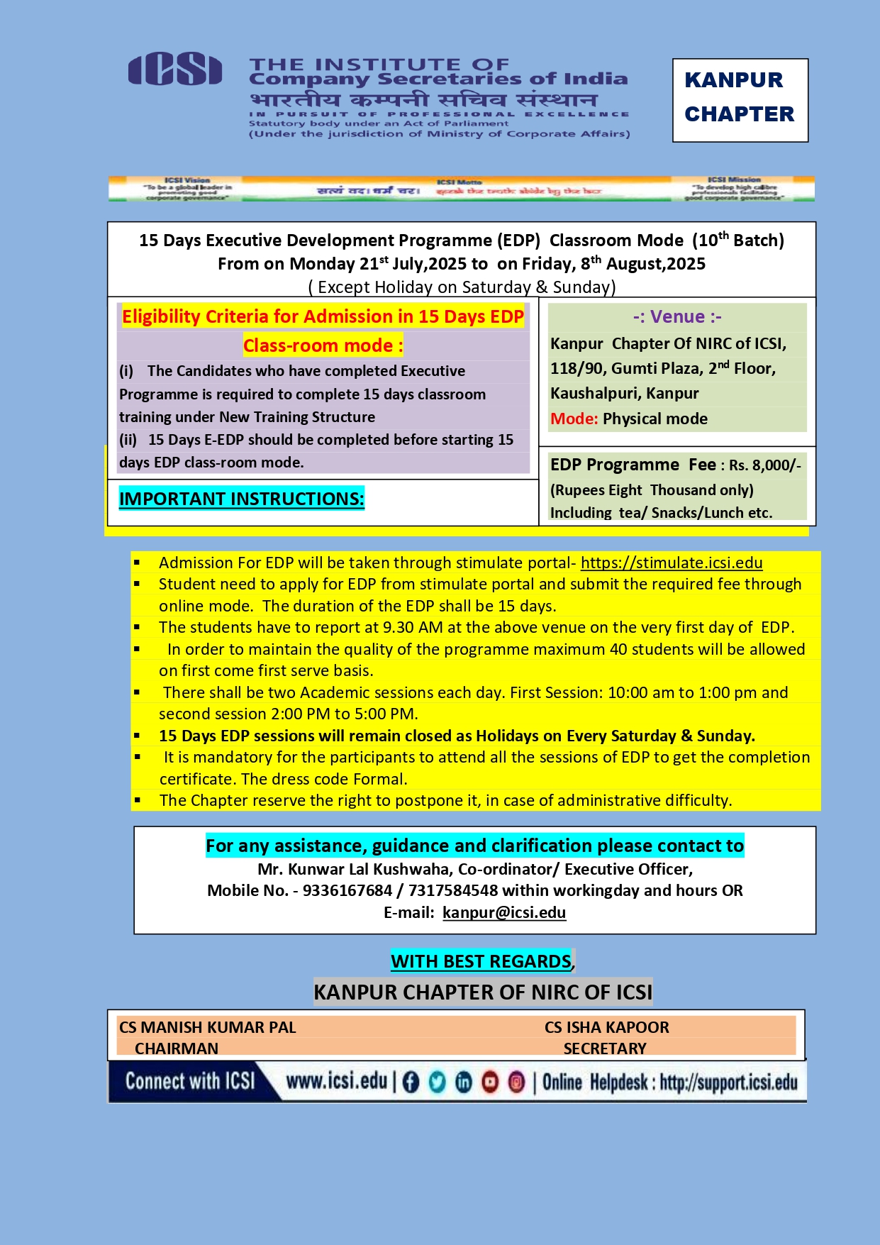 Phone : 0512-2296535, 7317584548, E-mail: kanpur@icsi.edu