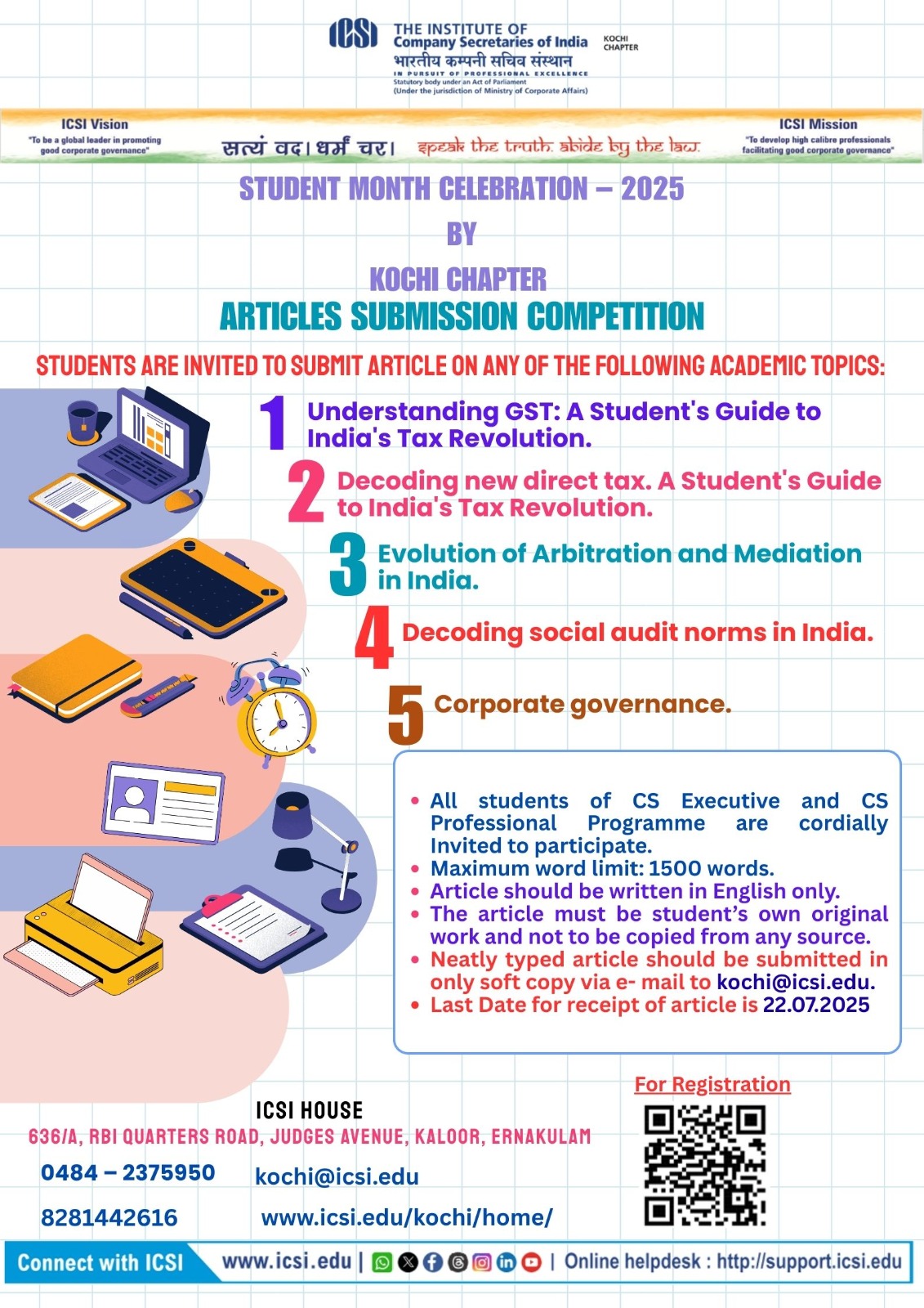 - ICSI- Kochi Chapter is organizing Article Writing Competition as a part of the Student Month Celebration- July 2025. Students are invited to submit articles on any of the following academic topics: