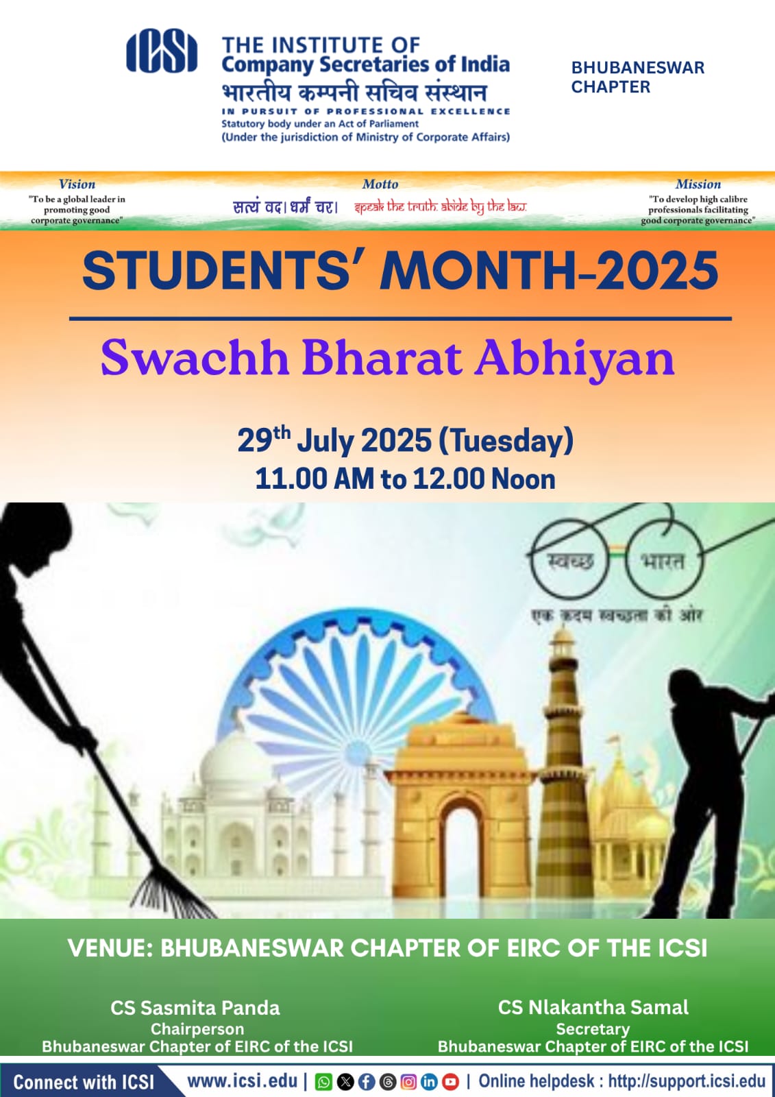- Bhubaneswar Chapter Organizing- Swachh Bharat Abhiyan on 29th July, 2025 at 11.00 a.m to 12.00 Noon . All students are attend the program and a grand success.