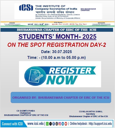 - Bhubaneswar Chapter Organizing- On the Spot Registration Day-2 on 30th July, 2025 at Chapter Office Premises at 10.00 a.m to 05.00 p.m. CSEET Pass students/Executive Program Registration & Professional Program Spot Registration on 30th July, 2025 at Chapter Office Premises.