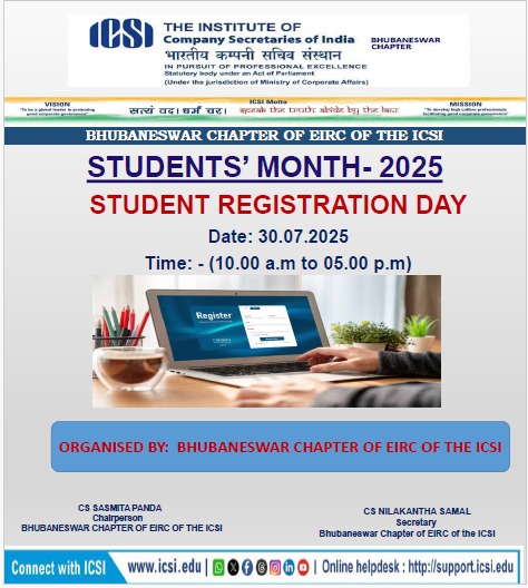 • Bhubaneswar Chapter Organizing- Student Registration Day on 30th July, 2025 at Chapter Office Premises. CSEET Registration/Executive Program Registration/Professional Program Registration on the said day. For any query please contact Chapter Office Premises: 0674-2552282/2551139/7978033845, bhubaneswar@icsi.edu