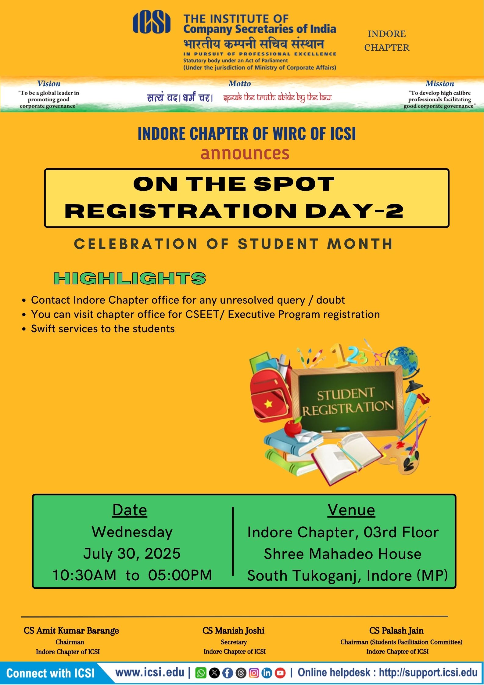 - Indore Chapter is organizing "On the Spot Registration Day -2" on 30.07.2025 from 10:30am to 05:00pm. Kindly come and register yourself for CSEET / Executive program and join Company Secretaryship Course