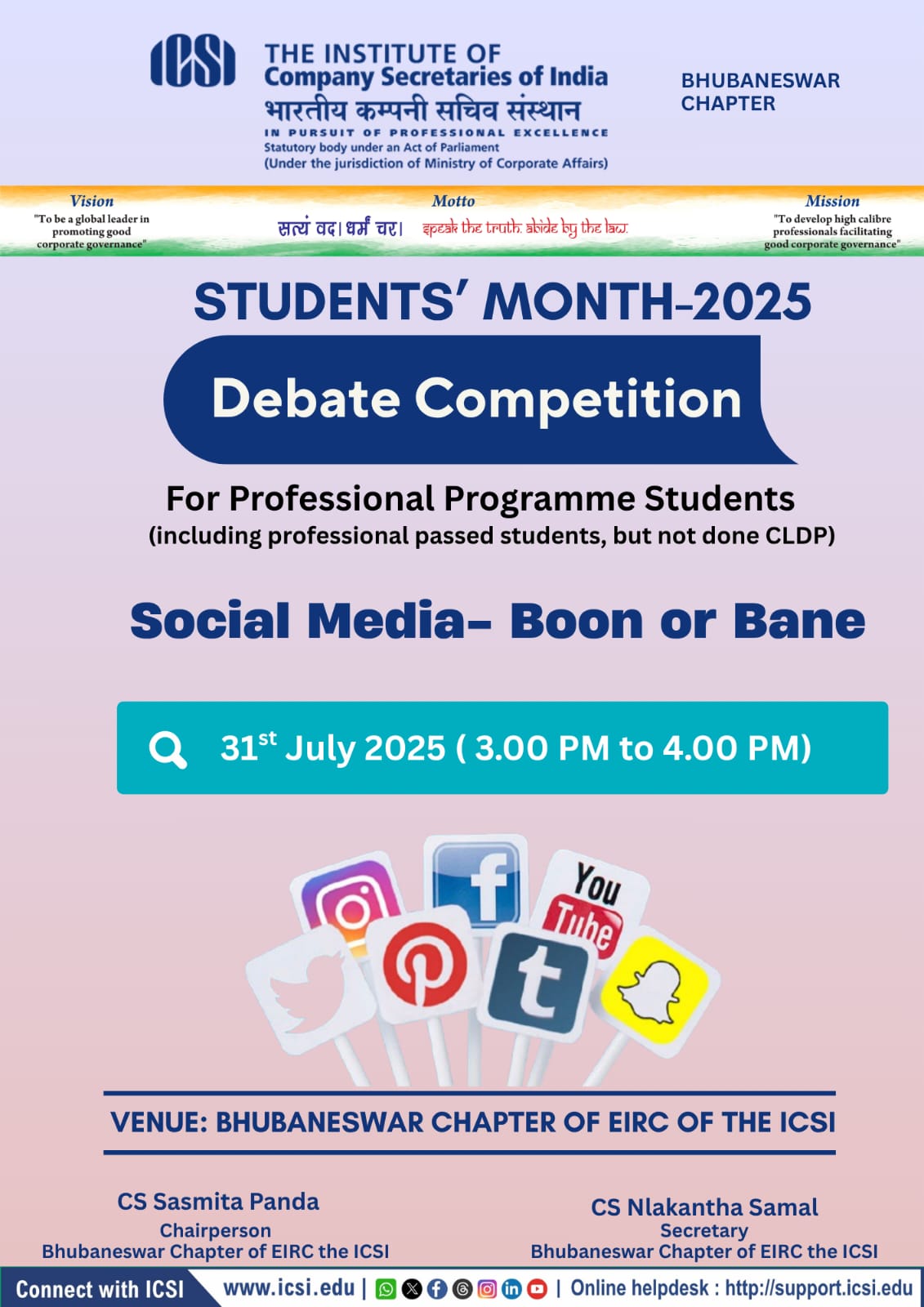 - Bhubaneswar Chapter Organizing- Debate Competition -Social Media- Boon or Bane at 03.00 p.m to 04.00 p.m at Chapter Office Premises. All Professional Program students will participate the program as per schedule. For any query please contact Chapter Office: 0674-2552282/2551139/7978033845, bhubaneswar@icsi.edu .