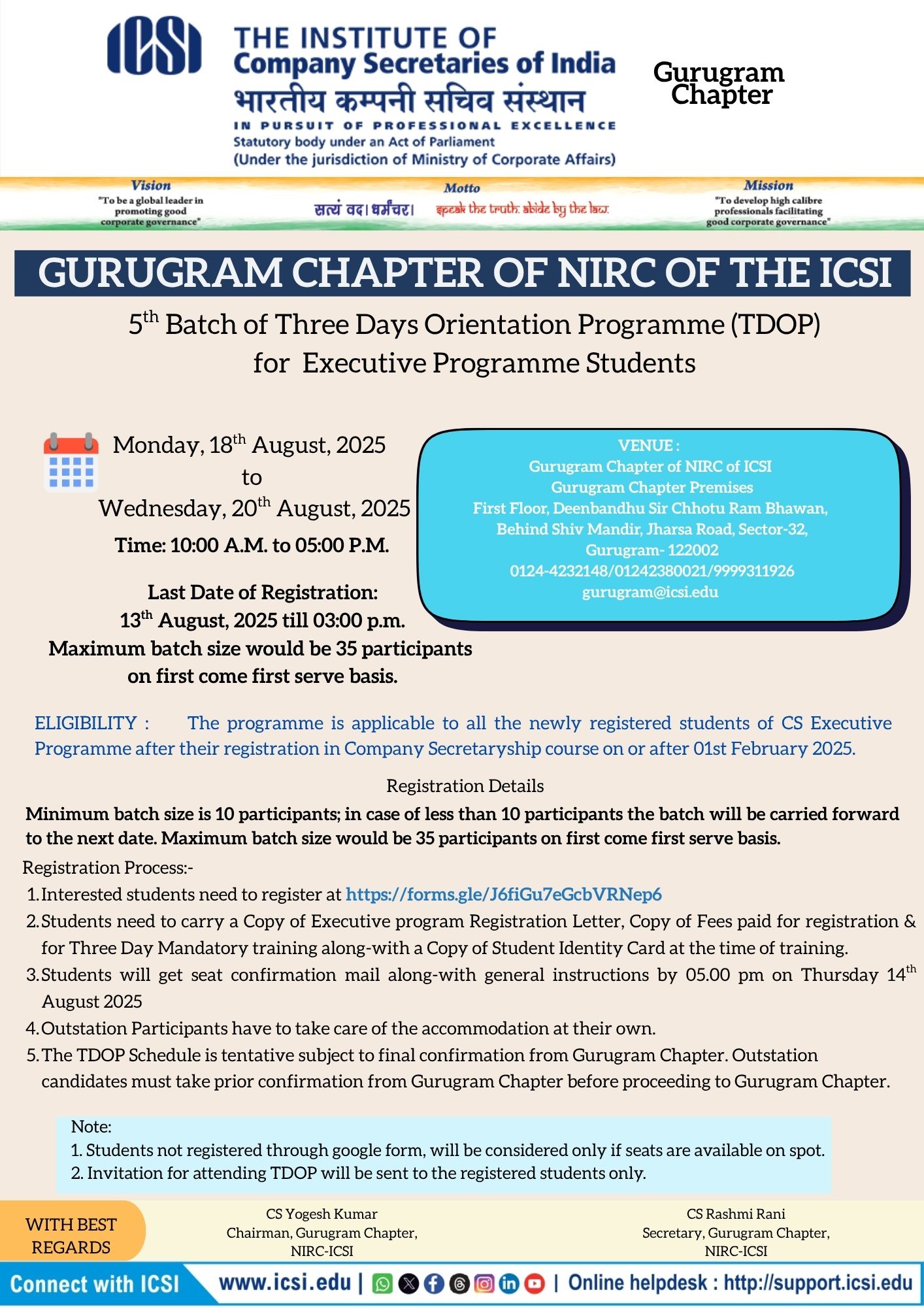 5th Batch of Three Days Orientation Program (TDOP) for students from 18th August 2025 to 20 August 2025 https://www.icsi.edu/media/filer_public/f5/86/f5866df2-37a5-4002-9d75-b964caecbb06/05th_tdop.pdf