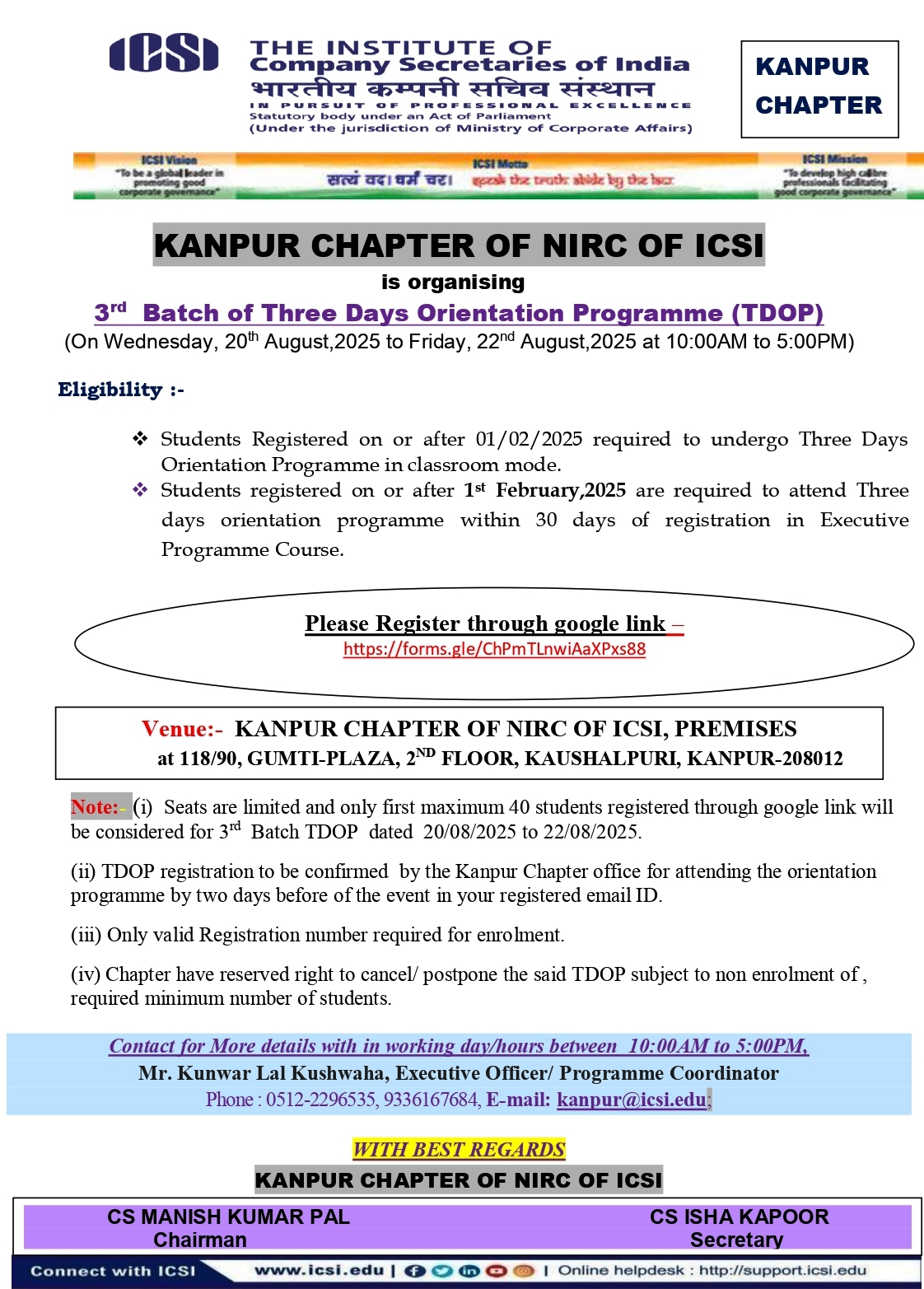 Phone : 0512-2296535, 9336167684, E-mail: kanpur@icsi.edu;