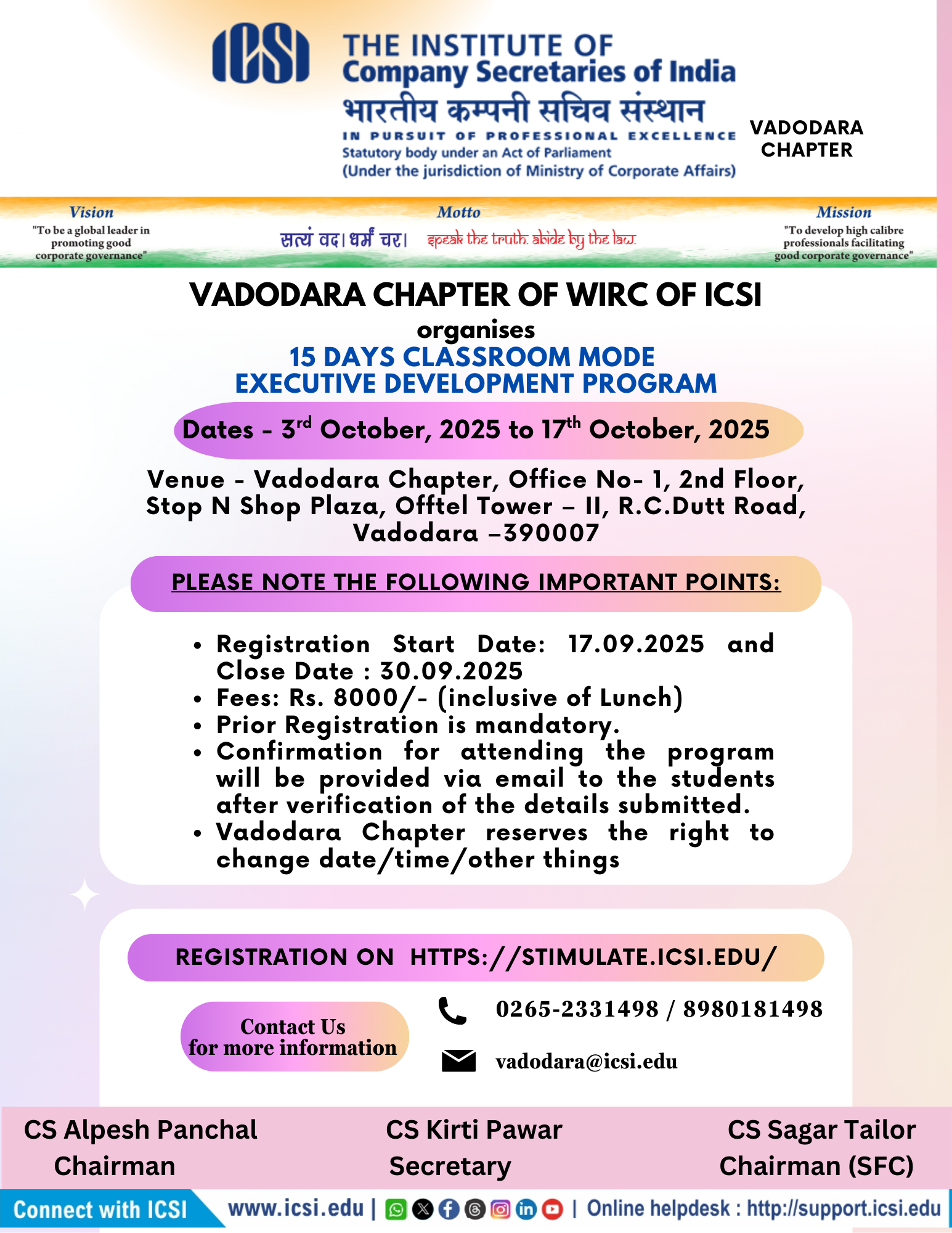 Vadodara Chapter organizes 15 Days Classroom Mode EDP from 03.10.2025 to 17.10.2025