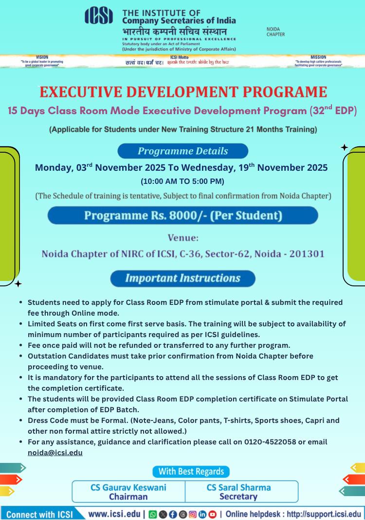 Noida Chapter 32nd Batch of 15 Days Class Room Mode EDP at Noida Chapter of NIRC of ICSI