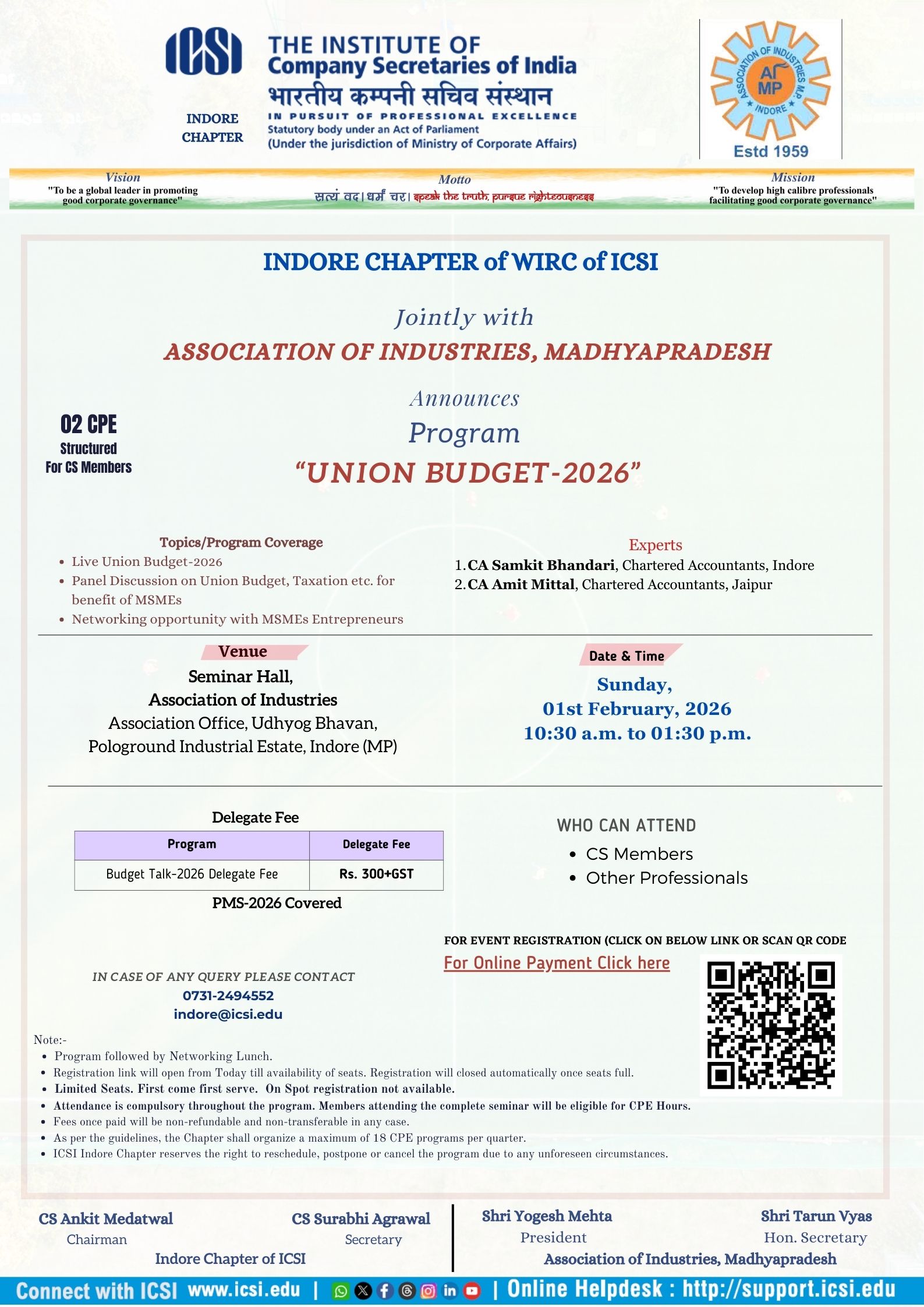 - Indore Chapter of ICSI is organising a Panel Discussion & Expert Talk on Live Union Budget 2026 jointly with Association of Industries, Madhya Pradesh on Sunday, 01st February, 2026 at 10.30 a.m. to 01.30 p.m. at Association Office, Udhyog Bhavan, Pologround, Indore. 2 CPE will be awarded under Structured category. Program followed by Lunch.