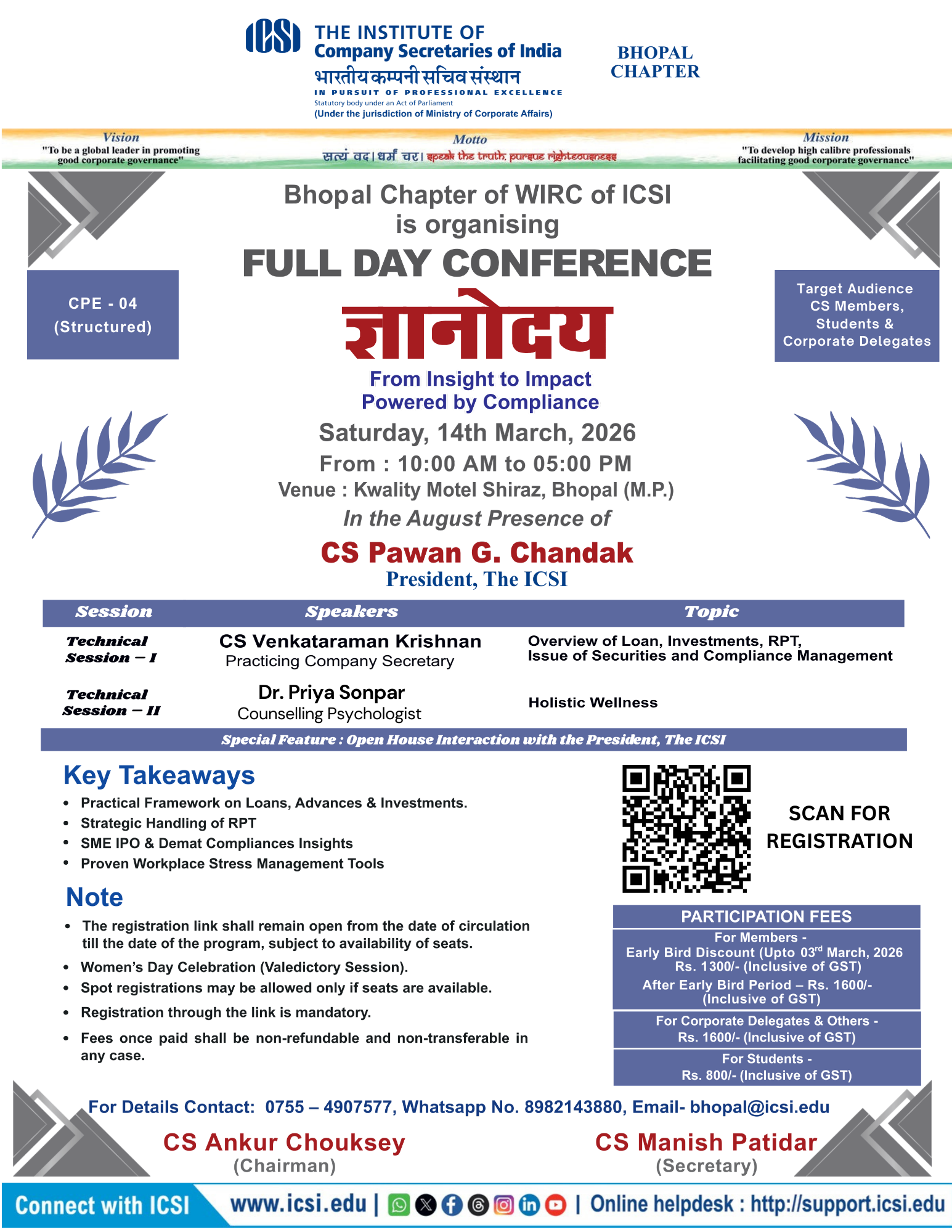 Bhopal-Full Day Conference on the theme "ज्ञानोदय From Insight to Impact – Powered by Compliance" on 14.03.2026