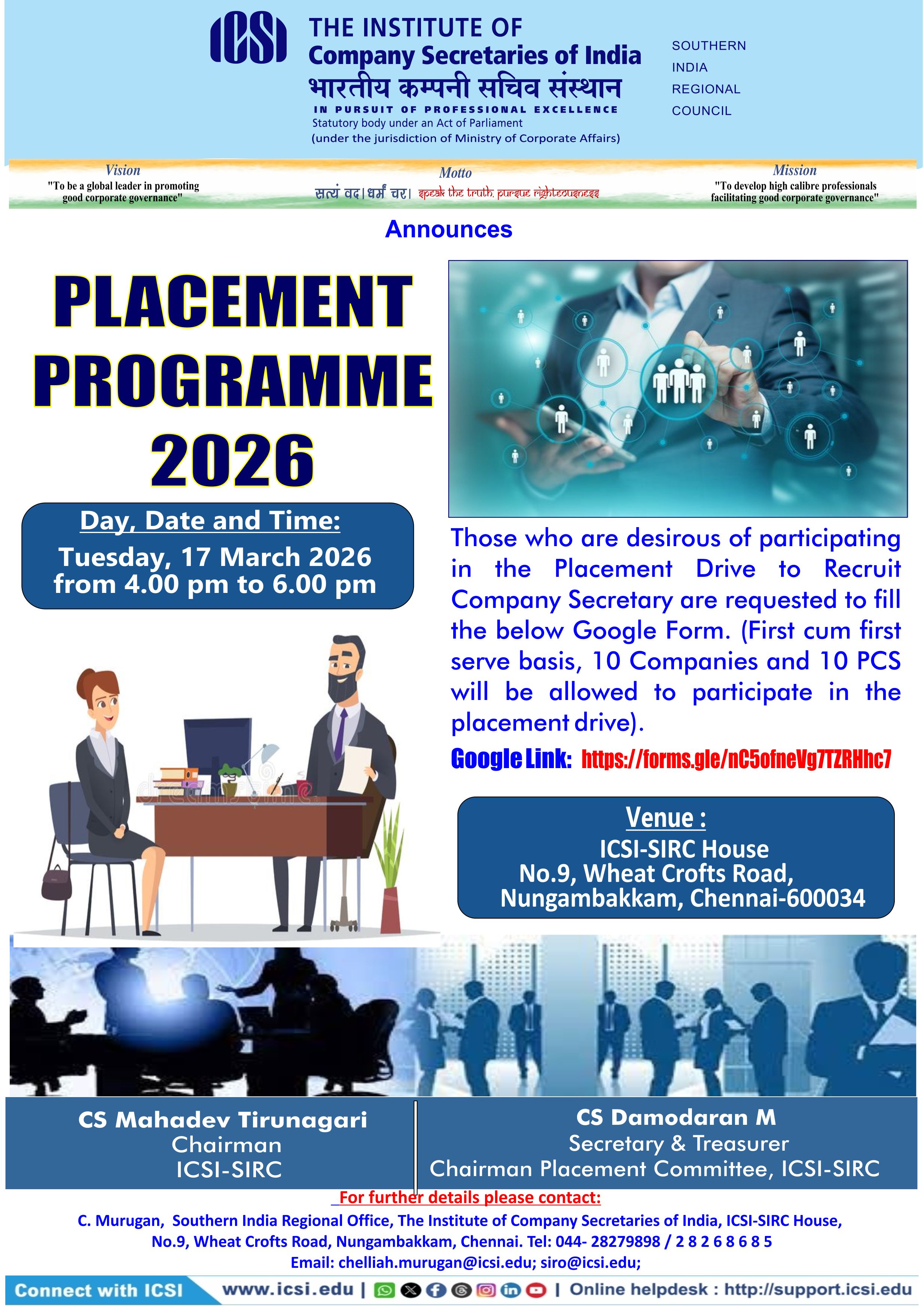 Placement Programme on Tuesday, 17 March 2026 at ICSI-SIRC House, Chennai (Recruit)