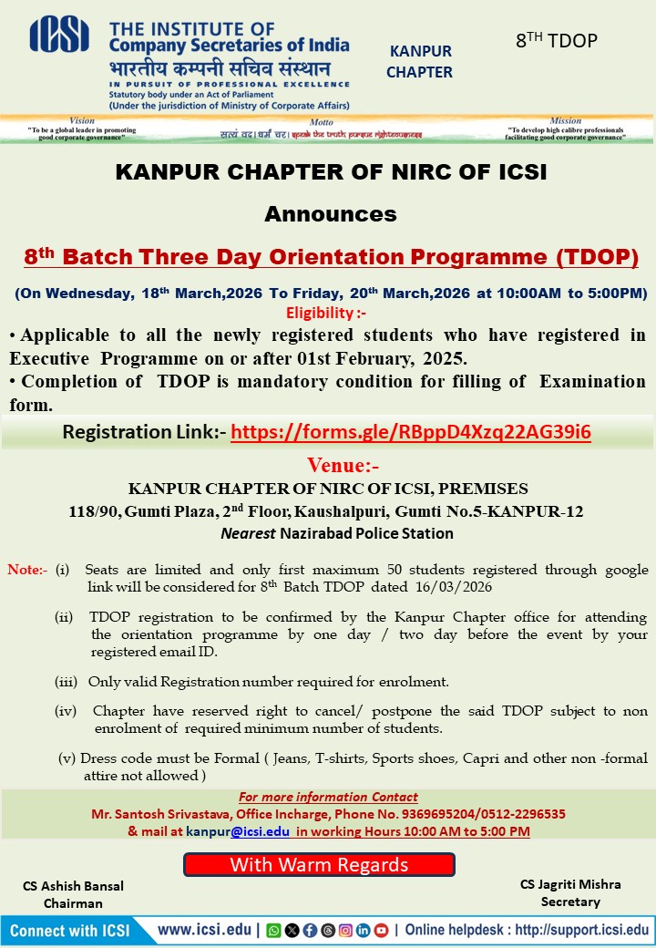 • KANPUR CHAPTER OF NIRC OF ICSI Announces 8th Batch Three Day Orientation Programme (TDOP) (On Wednesday, 18th March,2026 To Friday, 20th March,2026 at 10:00AM to 5:00PM) Eligibility :- Applicable to all the newly registered students who have registered in Executive Programme on or after 01st February, 2025. Completion of TDOP is mandatory condition for filling of Examination form. For more information Contact Mr. Santosh Srivastava, Office Incharge, Phone No. 9369695204/0512-2296535 & mail at kanpur@icsi.edu  in working Hours 10:00 AM to 5:00 PM