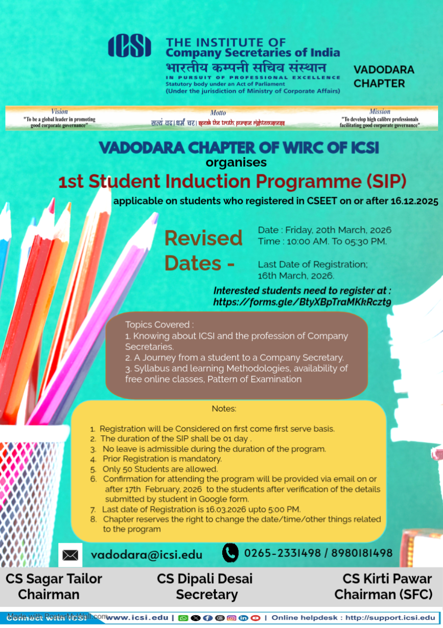 Vadodara Chapter organizes 1st Student Induction Program (SIP) on 20th March, 2026 (Friday) [revised date]