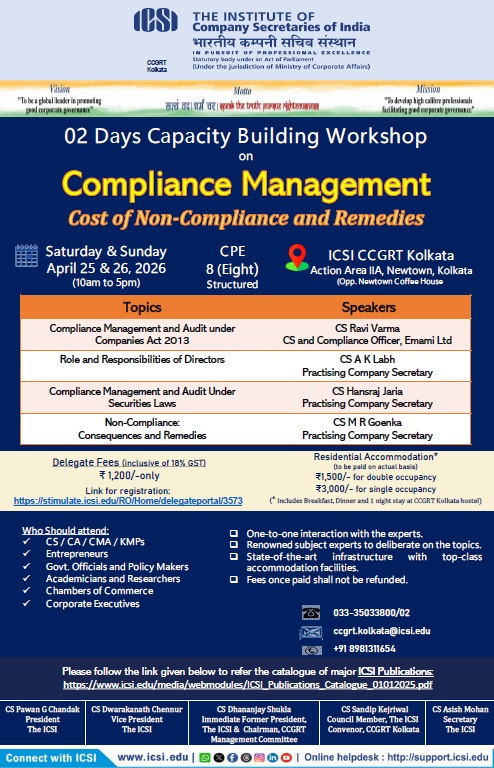 CCGRT Kolkata’s Capacity Building Workshop on Compliance Management, Cost of Non-Compliance and Remedies scheduled to be held on 25th and 26th April 2026