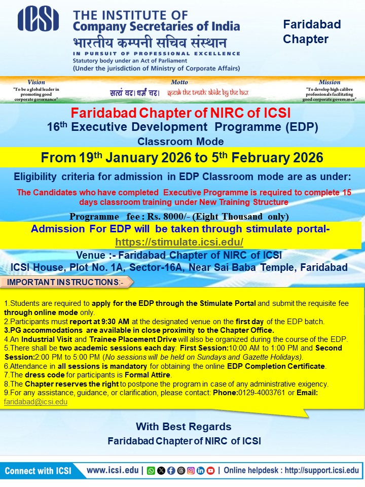 Faridabad Chapter of NIRC of ICSI announces Classroom its 16th Executive Development Program (EDP 16.0) From 19th January 2026 to 5th February 2026