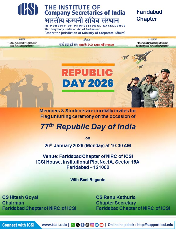 Faridabad Chapter of NIRC of ICSI Celebrate 77th Republic Day on 26th January 2026 at 10:30 AM