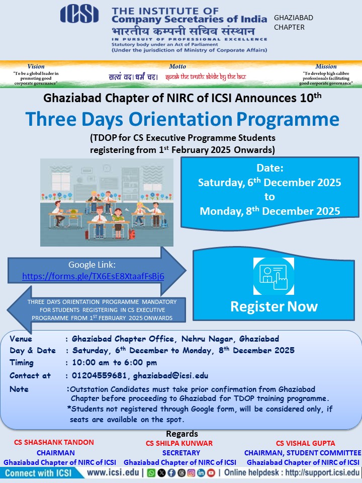 Three Days Orientation Programme (TDOP), for Students of CS Executive Programme, by Ghaziabad Chapter of NIRC of ICSI_Classroom Mode_Saturday 8th November to Monday 10th November, 2025