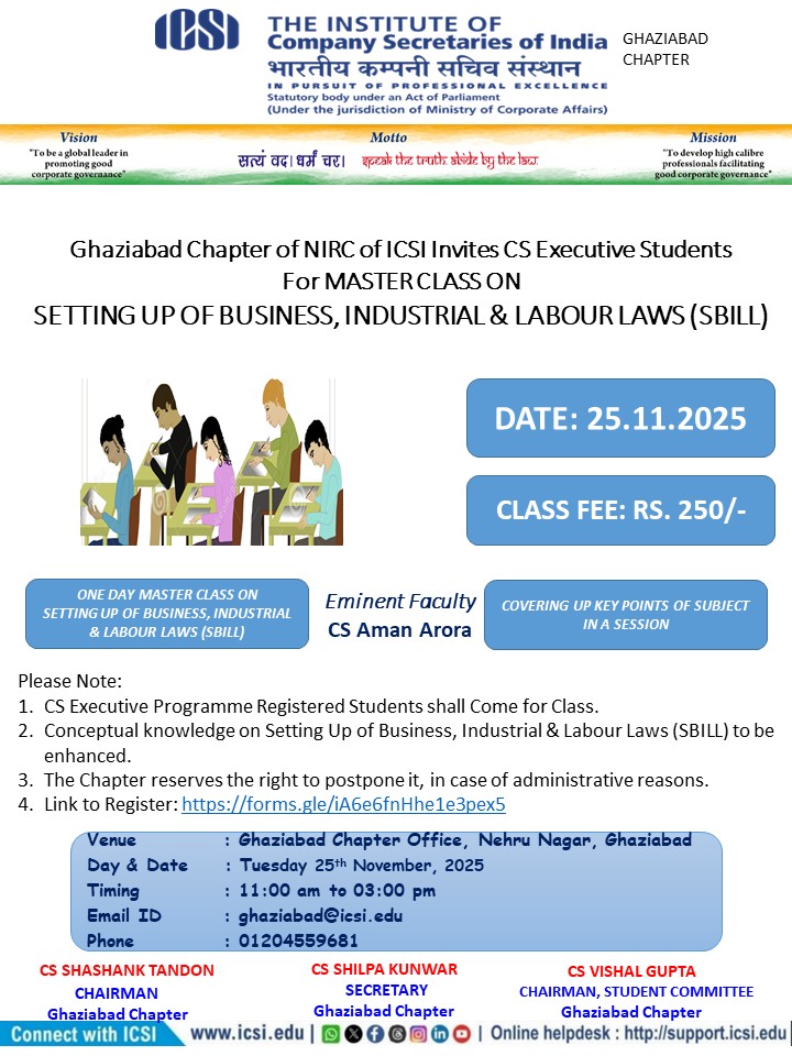 Announcement for Master Class on Setting Up of Business, Industrial & Labour Laws (SBILL) for CS Executive Programme Students by Ghaziabad Chapter of NIRC of ICSI_ Tuesday 25 November 2025 (Tentative)