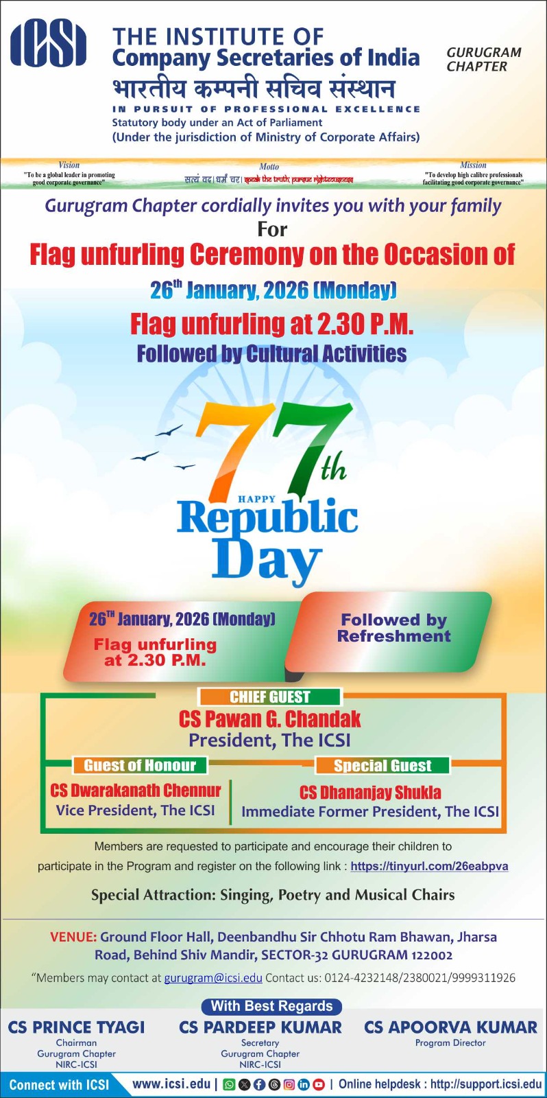 77th Republic Day Celebrations by Gurugram Chapter on Monday, 26.01.2026 from 02:30 p.m. onwards
