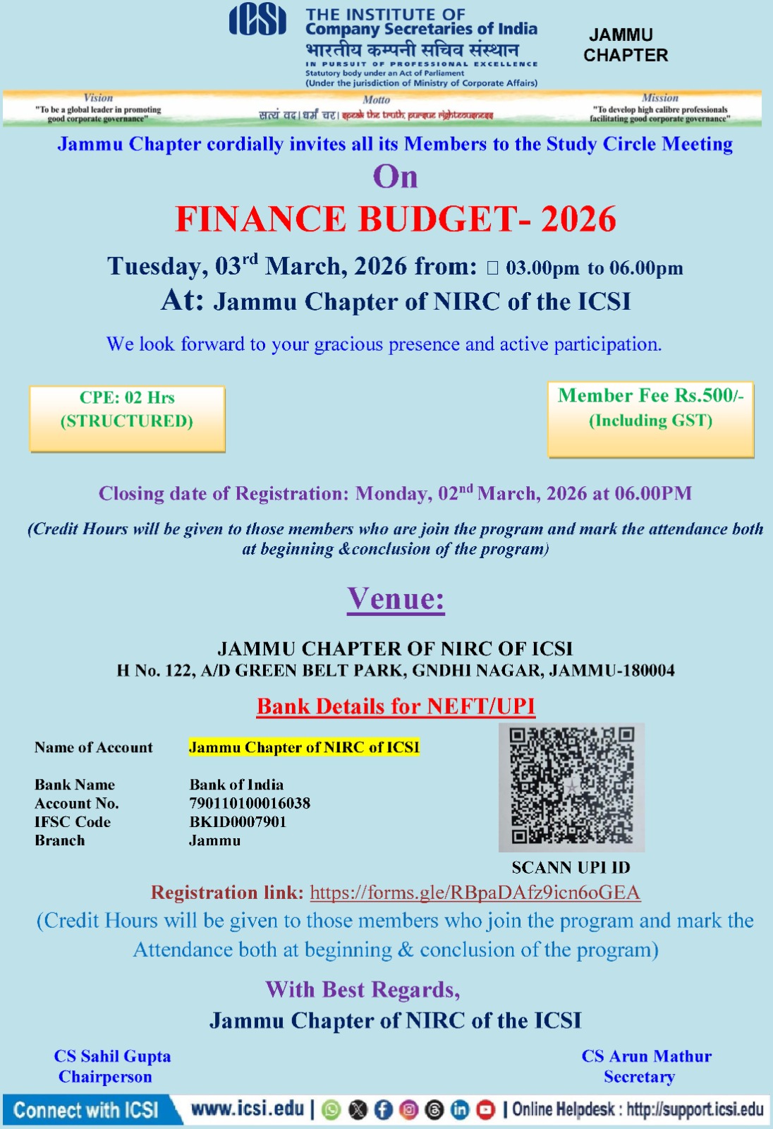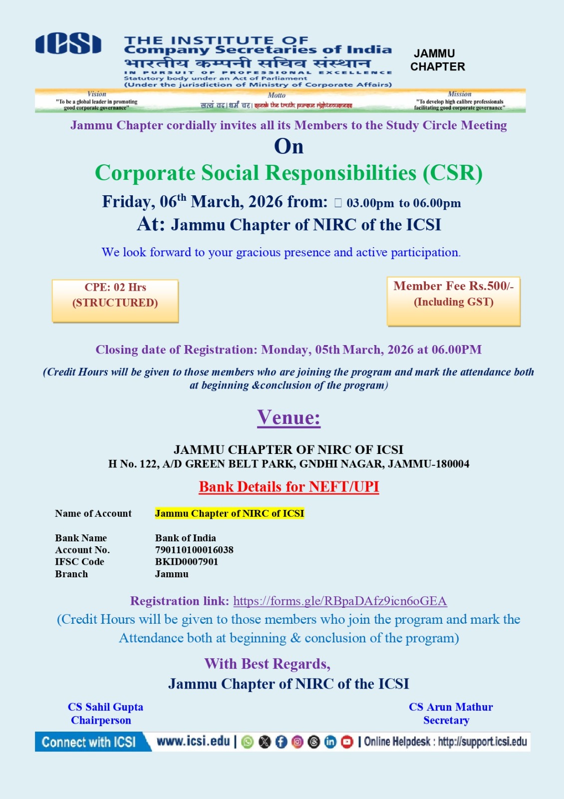 Jammu Chapter of NIRC of the ICSI House No-122 A/D, Green Belt Park Gandhi Nagar, JAMMU-180004 Phone | दूरभाष: +0191-2439242/+91 9040679085 Email: jammu@icsi.edu Web: www.icsi.edu