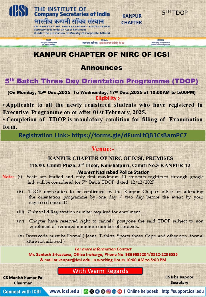 KANPUR CHAPTER OF NIRC OF ICSI Announces 5th Batch Three Day Orientation Programme (TDOP) (On Monday, 15th Dec.,2025 To Wednesday, 17th Dec.,2025 at 10:00AM to 5:00PM)