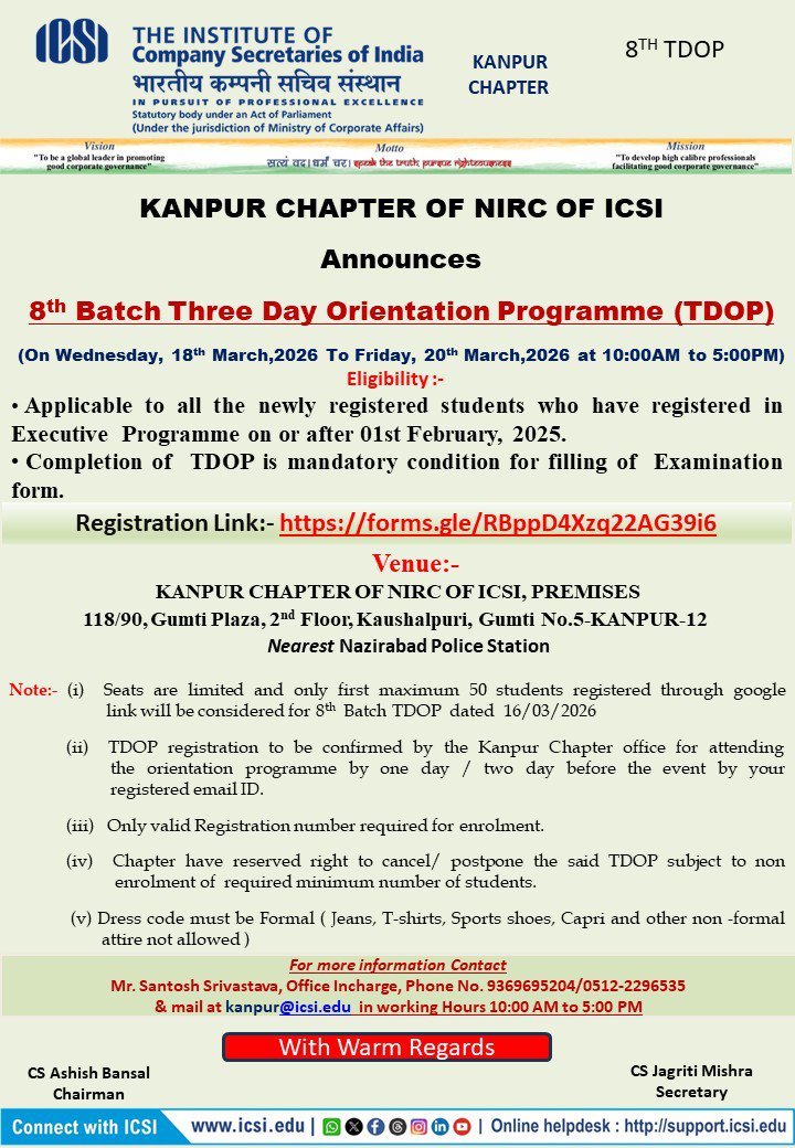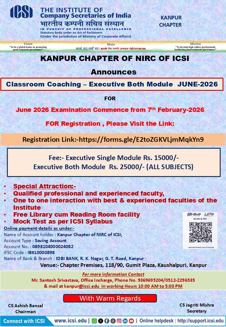 Kanpur Chapter is starting a new batch of Oral Coaching Classes for the Executive Programme (both modules) on 07th February-2026. Registration Link: https://forms.gle/E2toZGKVLjmMqkYn9