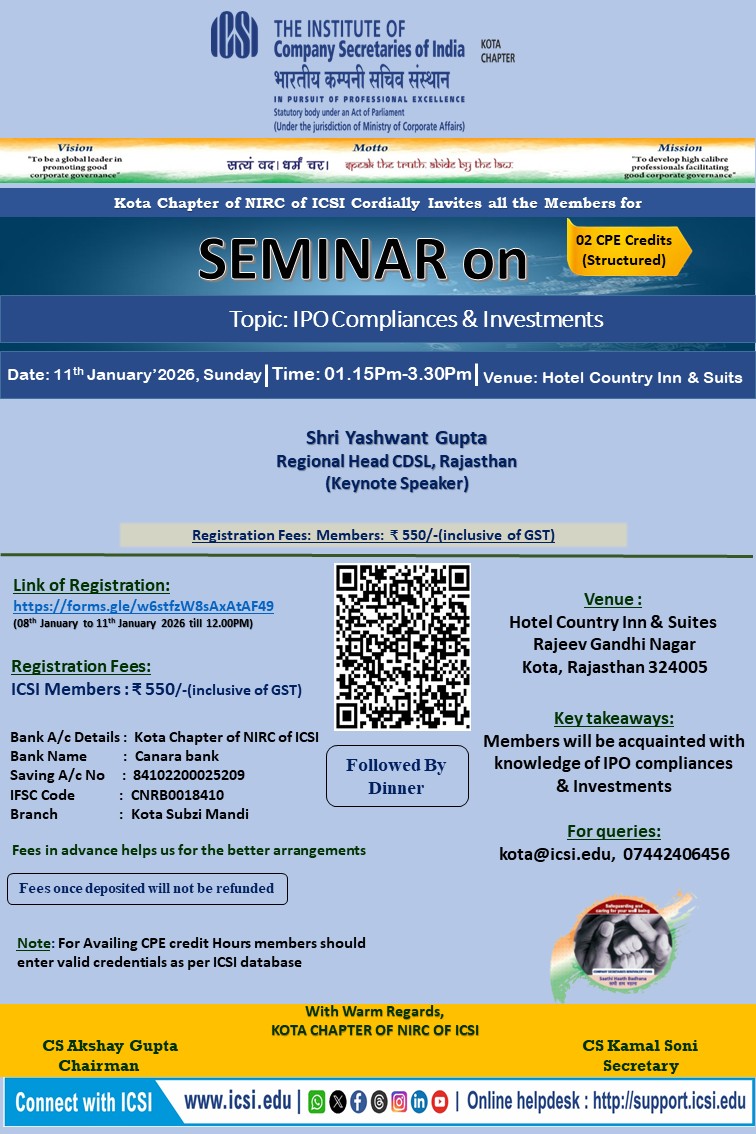 # ICSI Kota Chapter announces a Seminar on topic "IPO Compliances" on 11th January'2026 by 01.00 PM