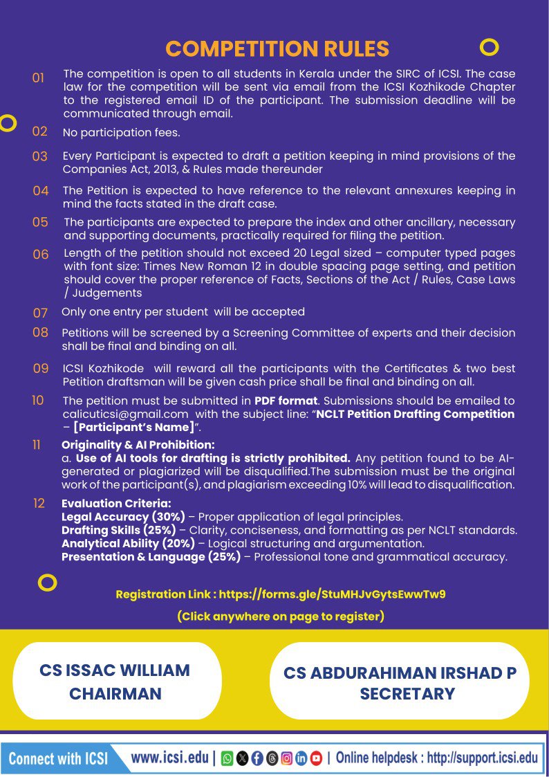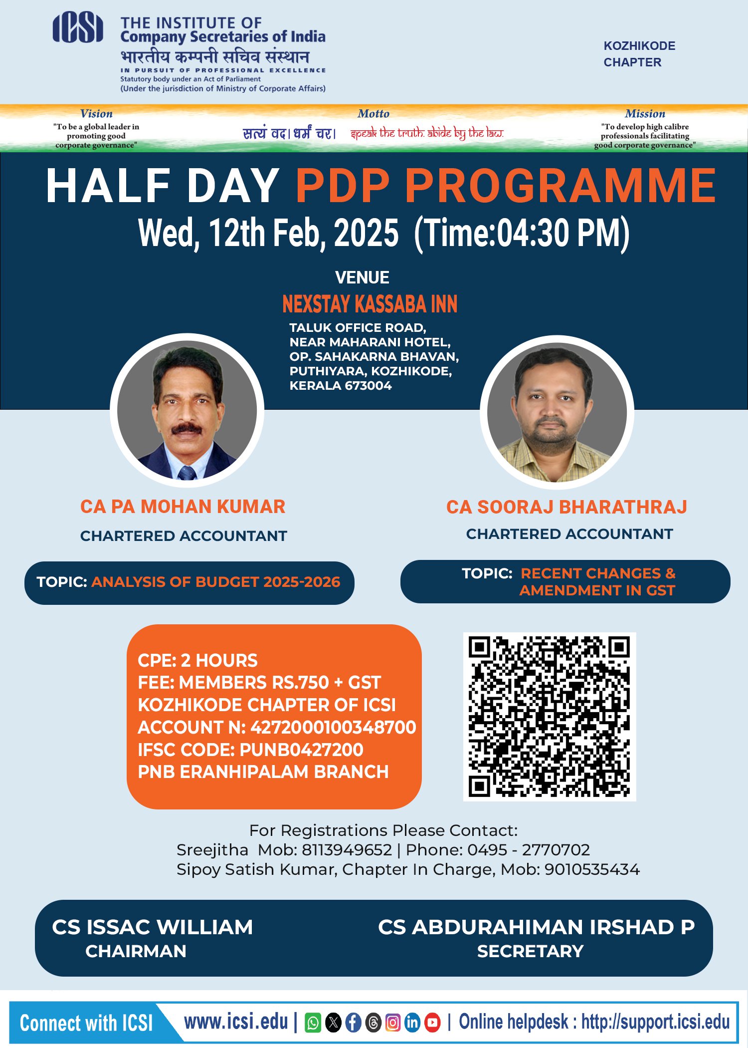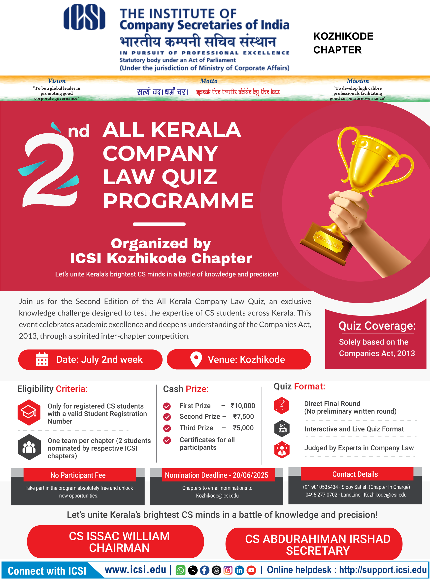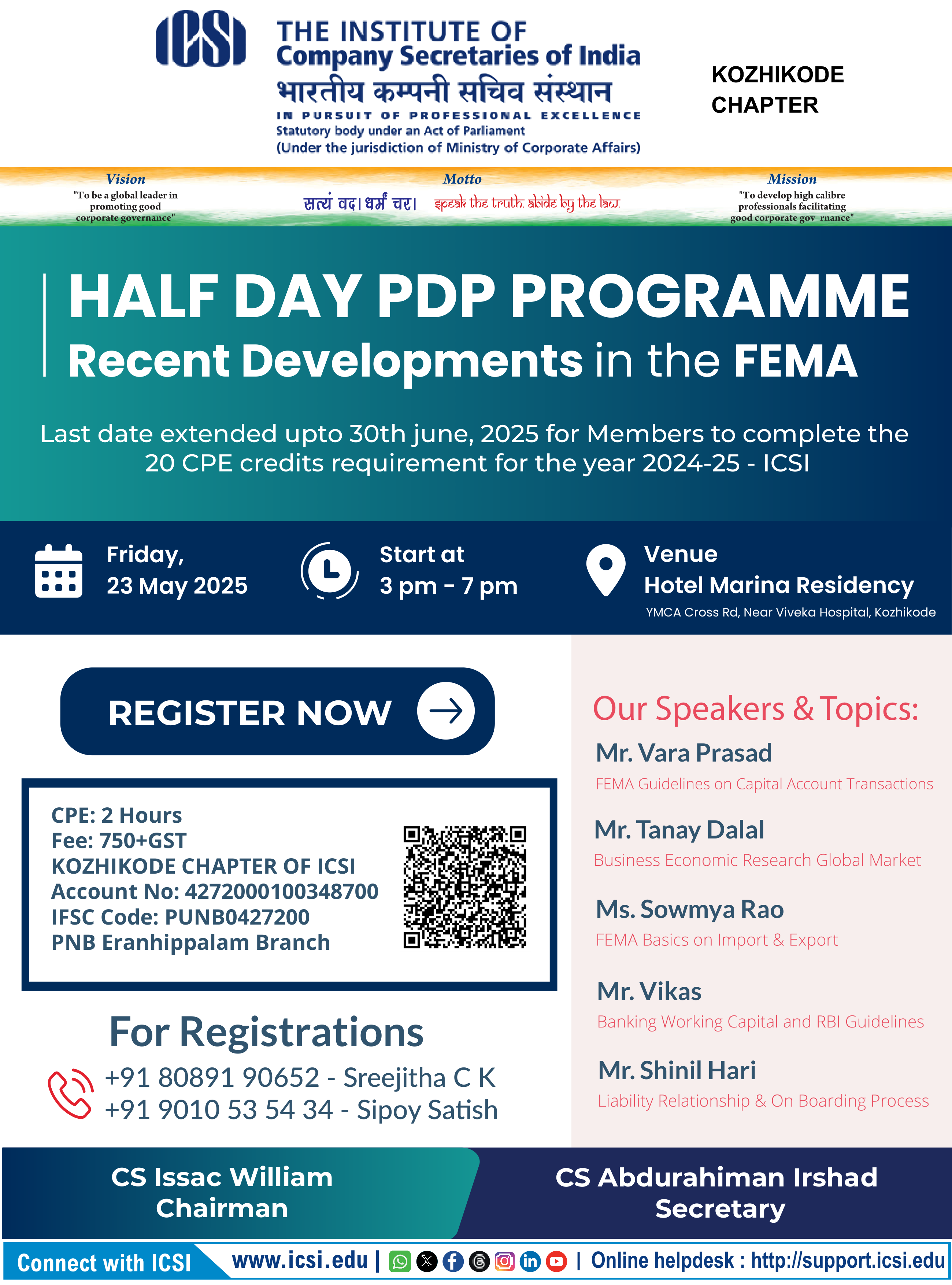 The ICSI Kozhikode Chapter joyfully celebrated the vibrant festival of Onam with great enthusiasm and traditional spirit. Students and members came together to interact, bond, and share festive moments of joy. The celebrations included the beautiful Pookkalam (floral decoration), a grand Onam Sadhya (traditional feast), and lively cultural exchanges, creating an atmosphere of unity and togetherness.