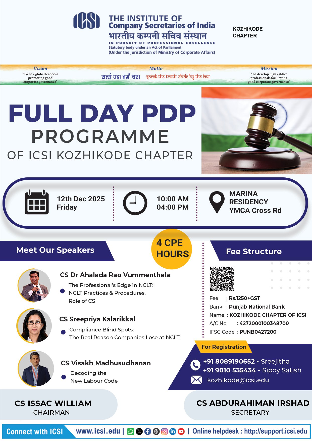 The ICSI Kozhikode Chapter successfully organized a Full Day Professional Development Programme (PDP) on 12th December 2025 (Friday) at Hotel Marina Residency, YMCA Cross Road, Kozhikode. The event was designed to enrich the professional knowledge of Company Secretaries and Executive/Professional Programme students, with a special focus on emerging compliance trends, NCLT practices, and the new labour code.
