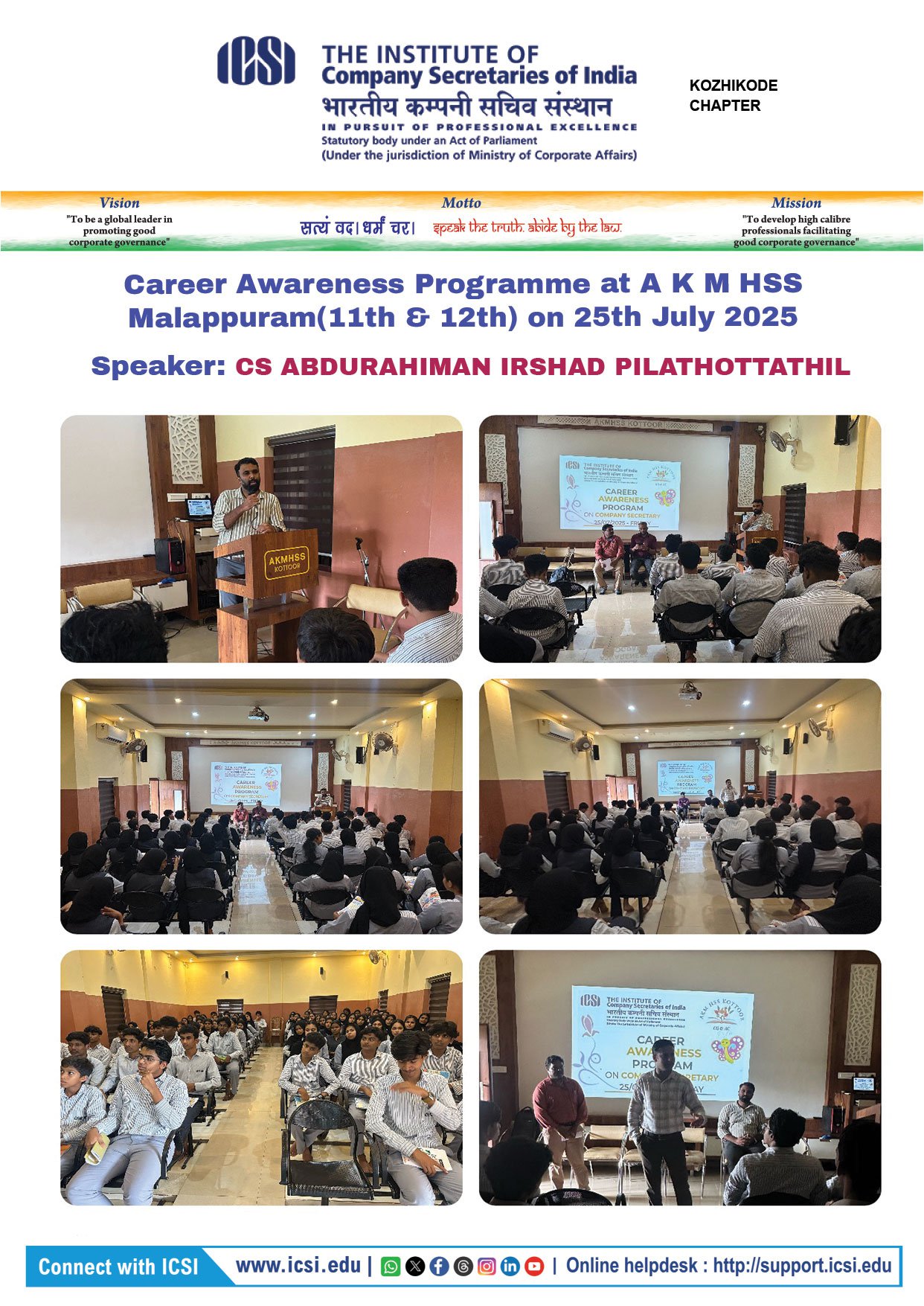 The ICSI Kozhikode Chapter extends its sincere appreciation to the management, faculty, and students of A.K.M. HSS for their warm hospitality and support in facilitating this impactful outreach initiative. We look forward to continued collaboration in shaping the future of aspiring professionals.