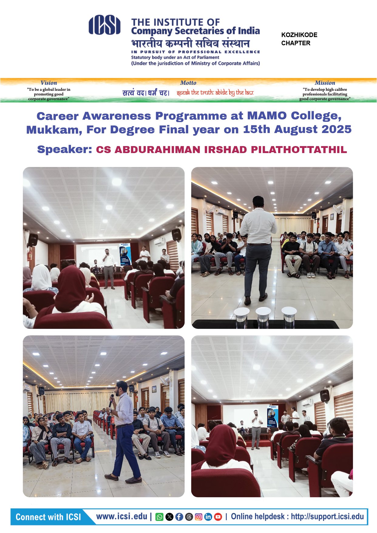 The ICSI Kozhikode Chapter organized a Career Awareness Programme (CAP) at MAMO College, Mukkam on 15th August 2025 for the final-year degree students, as part of its continued efforts to promote the Company Secretary (CS) profession among young graduates.