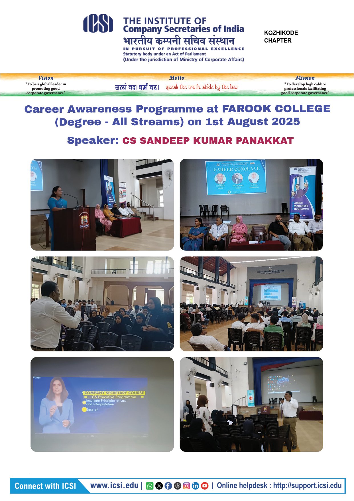 We extend our sincere appreciation to Farook College (Autonomous) for their warm support and for facilitating this opportunity to connect with aspiring professionals and create awareness about the Company Secretary career path