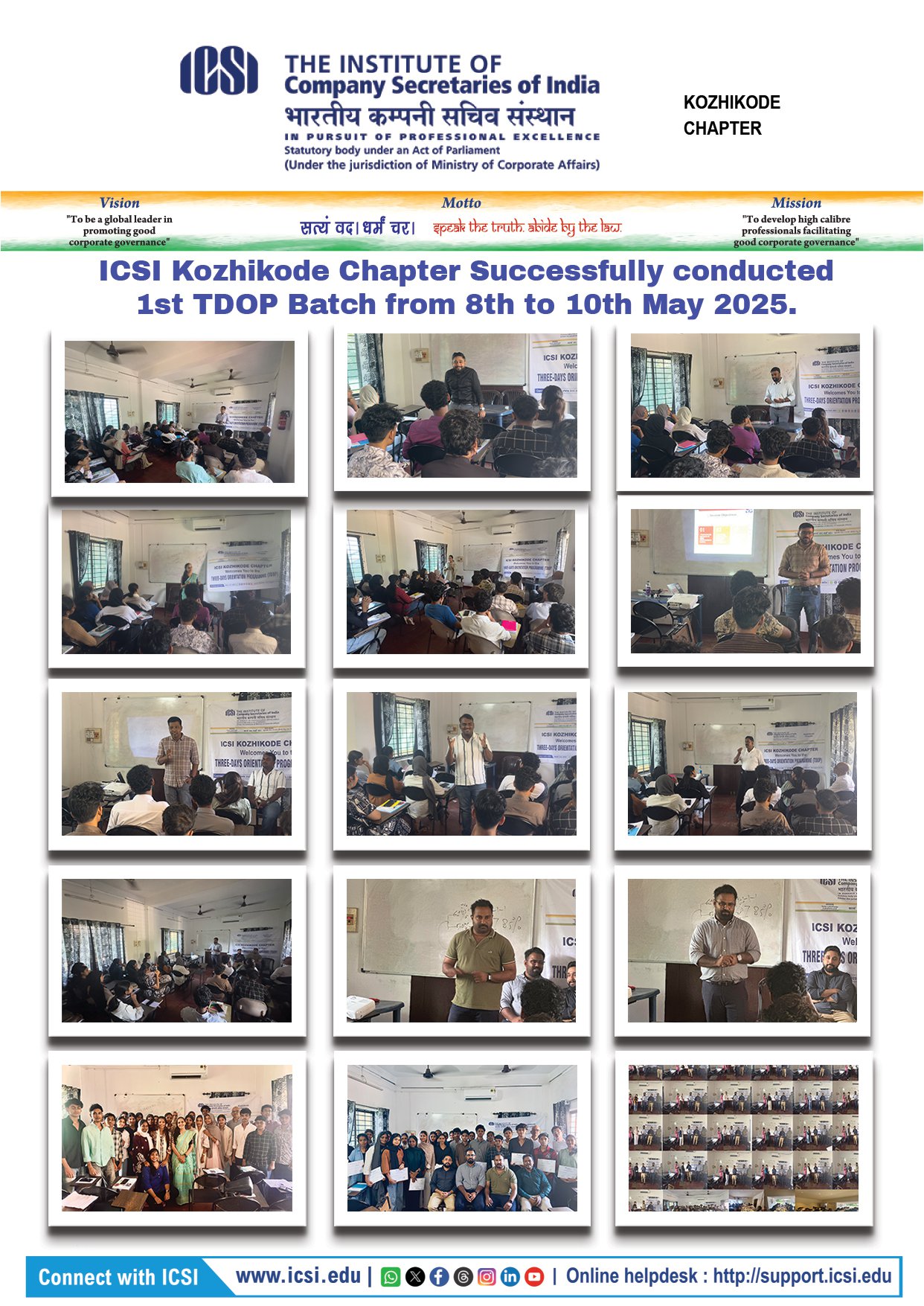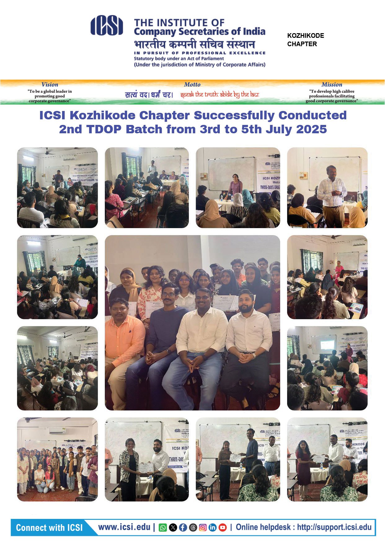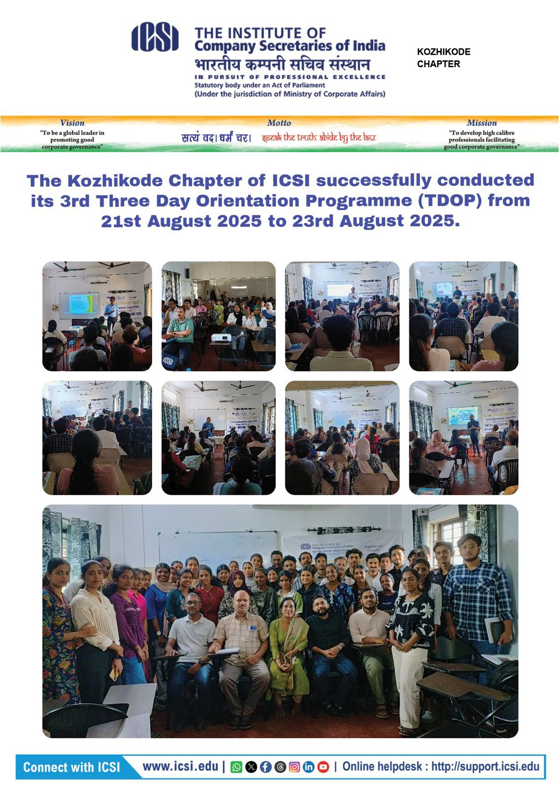 The Three-Day Orientation Programme proved to be a valuable and enriching initiative, empowering students with foundational knowledge and inspiration to pursue a successful career in Company Secretaryship. The Kozhikode Chapter reaffirms its commitment to nurturing and supporting future professionals in their journey toward excellence.