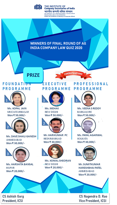 - Winners of Final Round of All India Company Law Quiz – 2020
