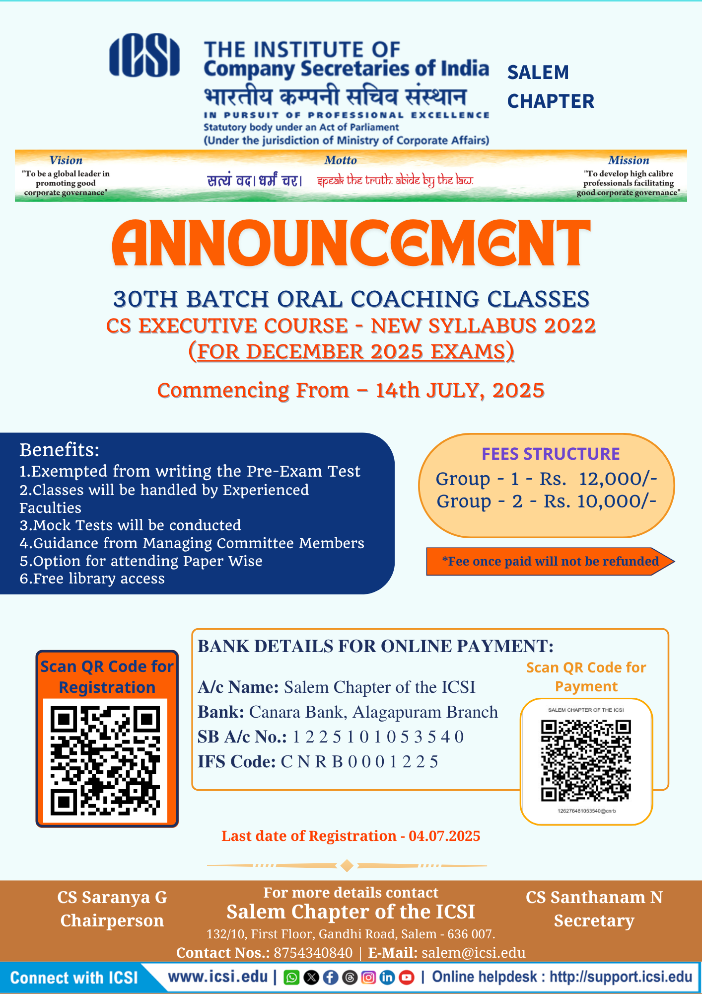 Contact Details for Class Room Teaching @ ICSI - Salem Chapter