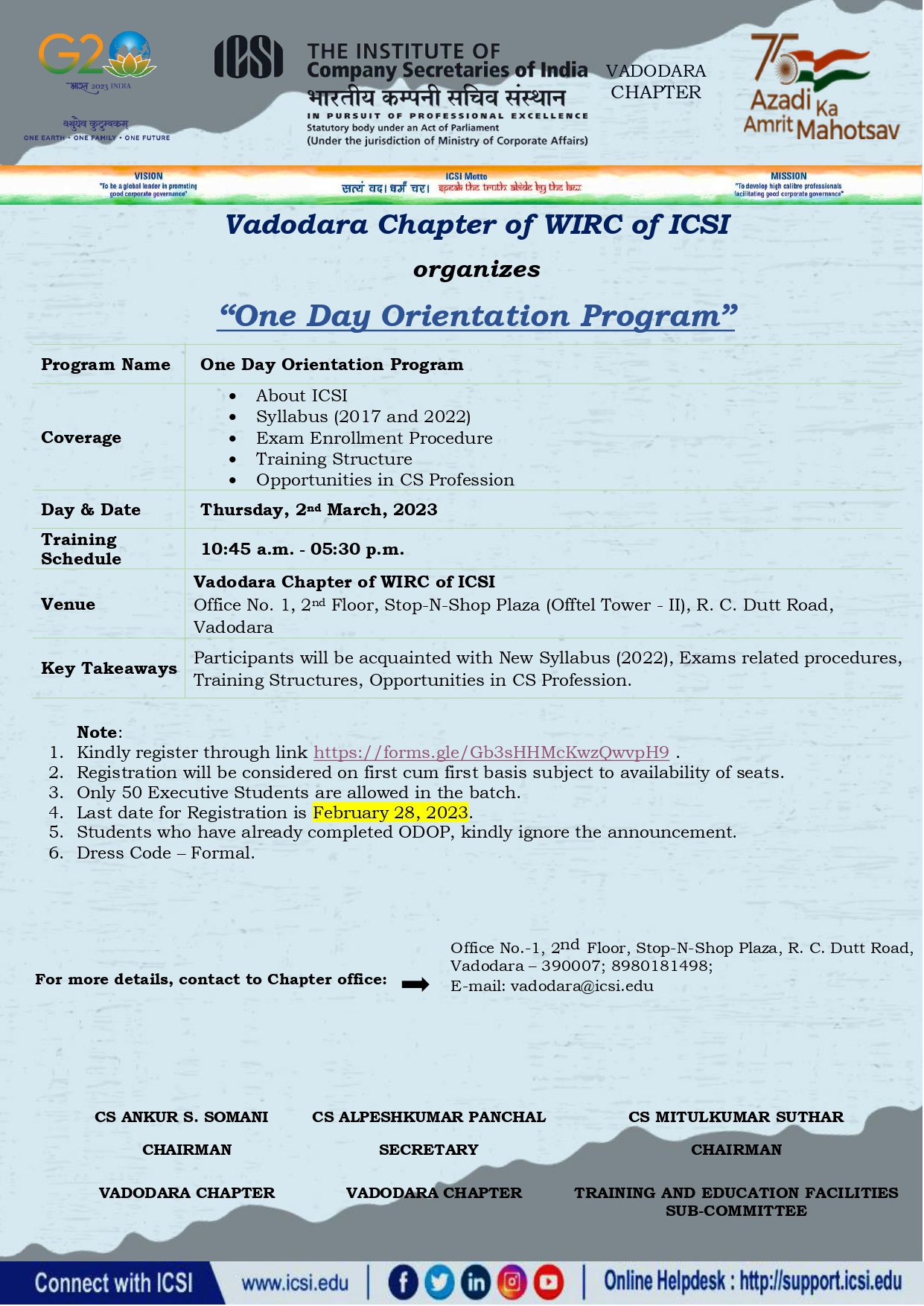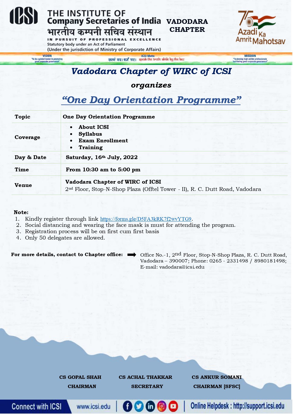 Vadodara Chapter organizes Half Day Program on 30th August, 2025 from 2:45 PM to 8:00 PM