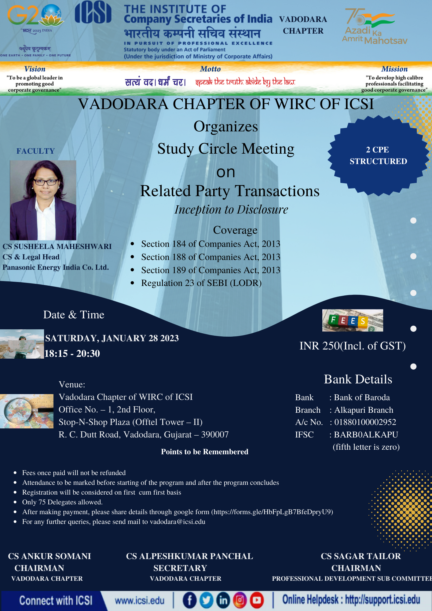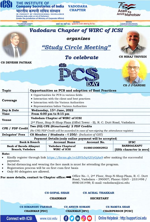 Vadodara Chapter is organising Study Circle Meeting on 19th April, 2025 from 5:45 PM to 8:15 PM