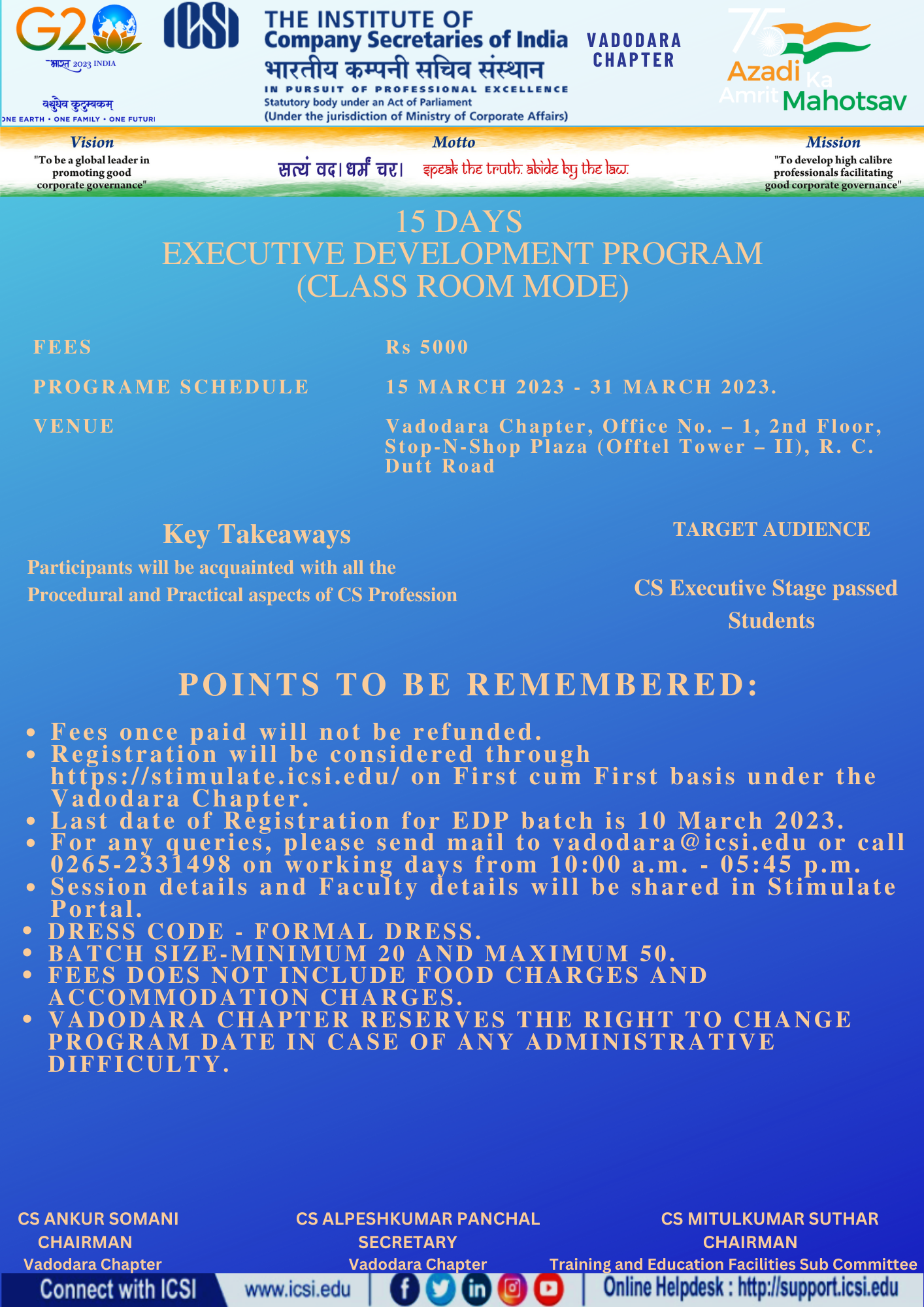 Vadodara Chapter organises 15 Days Classroom mode EDP from 28.04.25 to 14.05.25